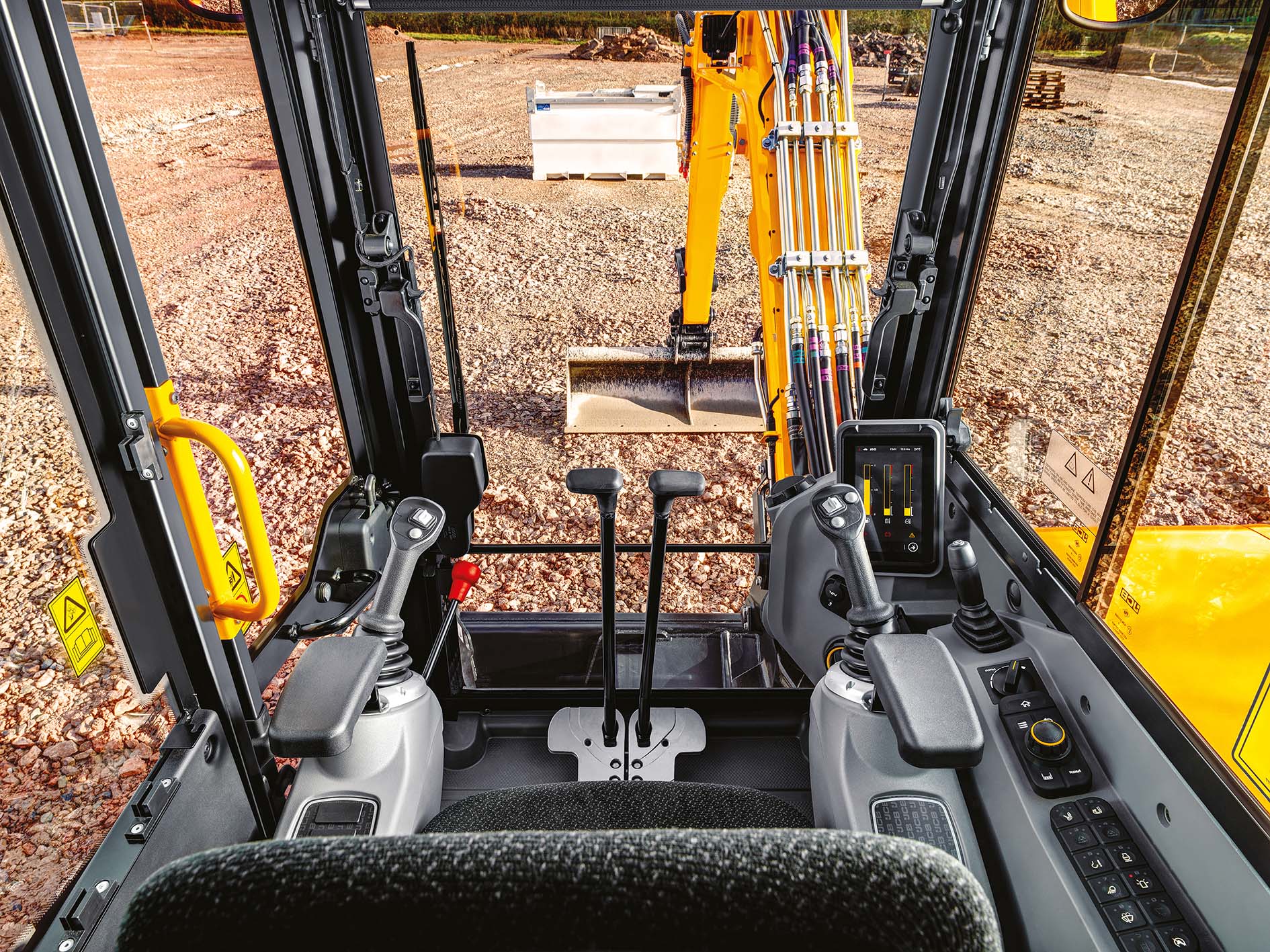 All’interno della cabina, il layout è stato migliorato, includendo uno schermo a colori da 7″ verticale come quello già presente sulla gamma degli escavatori da 8-10 tonnellate. Gli operatori possono programmare i flussi idraulici ausiliari, con impostazioni di flusso sia High che Low, per un massimo di 10 attrezzature, riducendo così i tempi di fermo durante il cambio delle stesse. La telecamera posteriore integrata può essere diretta allo schermo principale, eliminando la necessità di un monitor secondario in cabina.