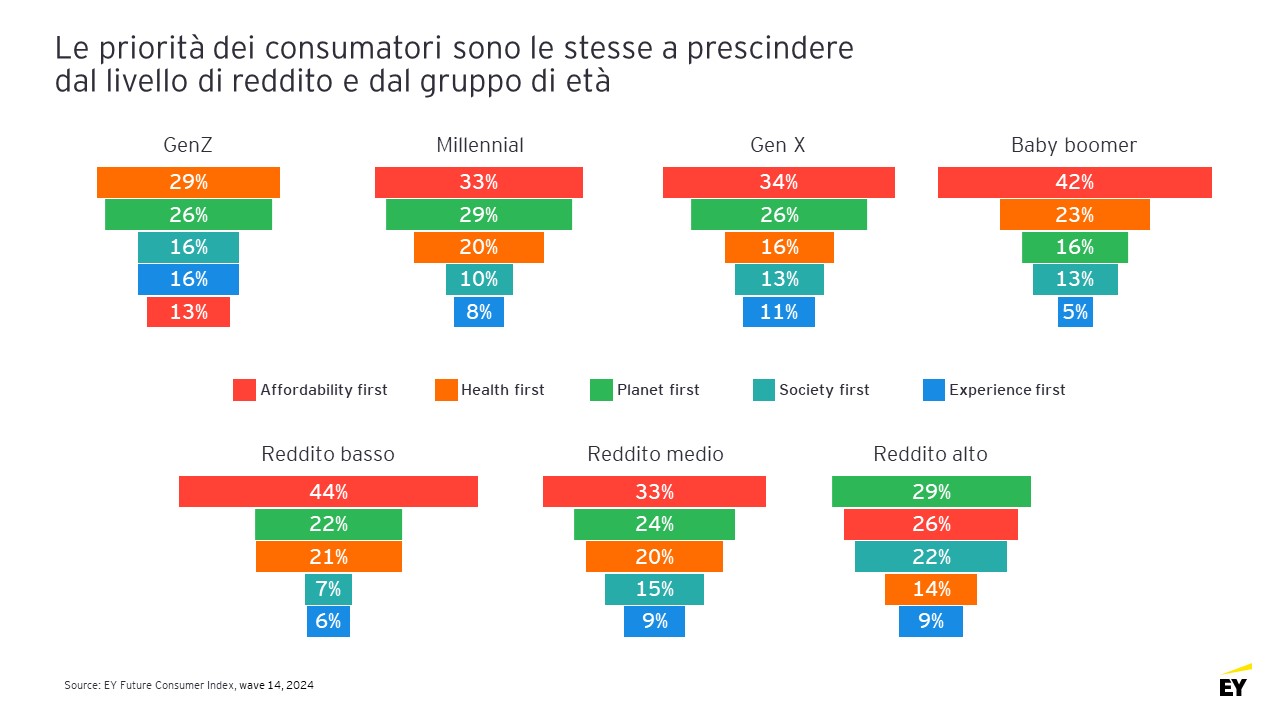 L’indagine rivela che gli italiani prestano grande attenzione alle tematiche legate all’ambiente e alla sostenibilità, posizionando l’Italia tra i Paesi con una più alta priorità ambientale, con il 75% preoccupato per il cambiamento climatico e il 49% che orienta i propri acquisti in ottica di sostenibilità. Le priorità sono omogenee per tutti i livelli di reddito e fasce d’età: i Baby Boomer, Gen X e Millennial pongono attenzione sull’accessibilità economica (rispettivamente 42%, 34% e 33%), seguita dai temi di sostenibilità (rispettivamente 16%, 26%, 29%). Per la Gen Z, la salute è la priorità principale (29%), seguita dalla sostenibilità (26%), con l’accessibilità economica all’ultimo posto (13%).