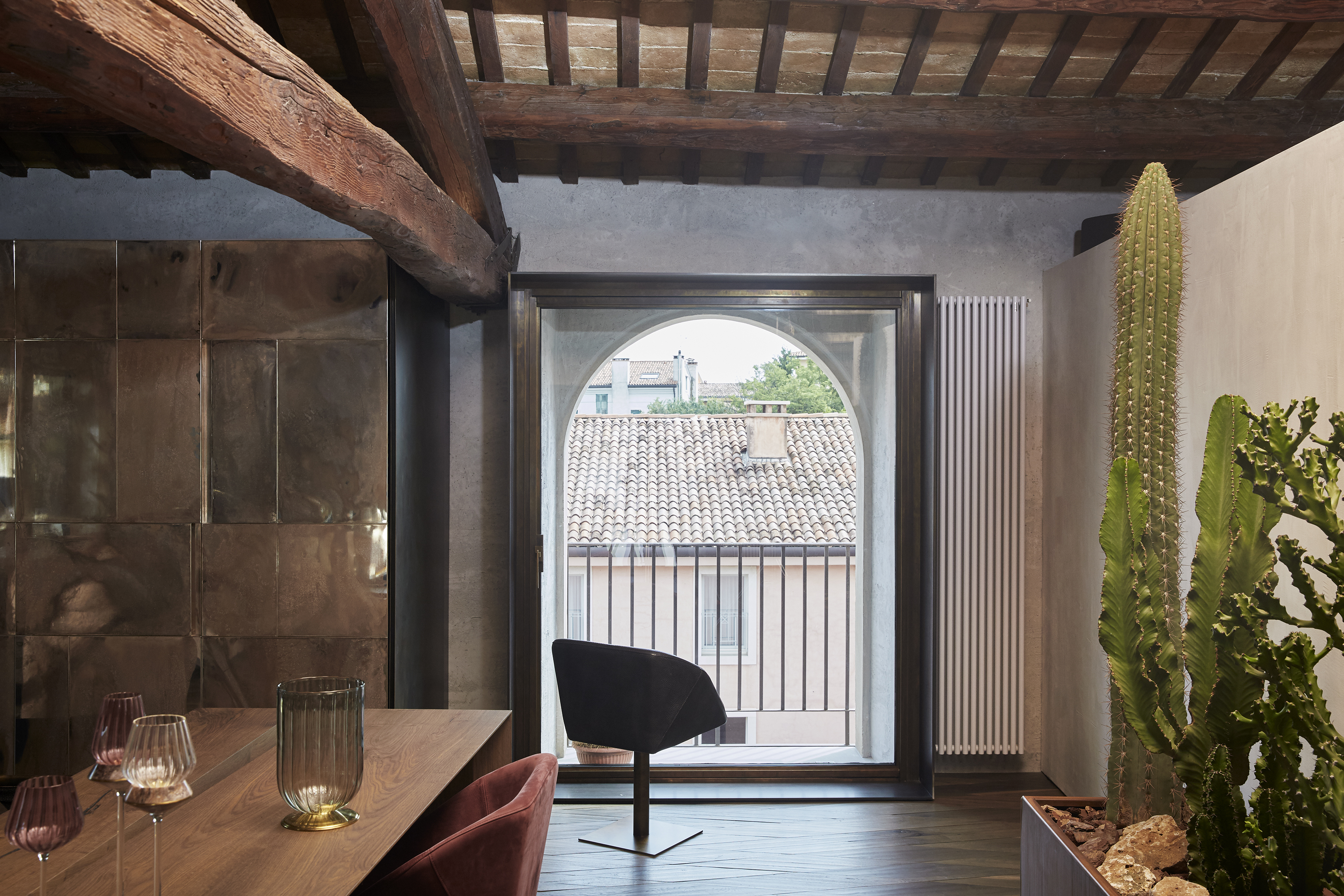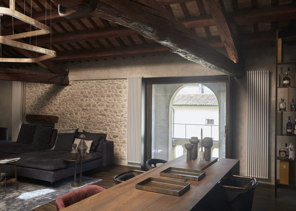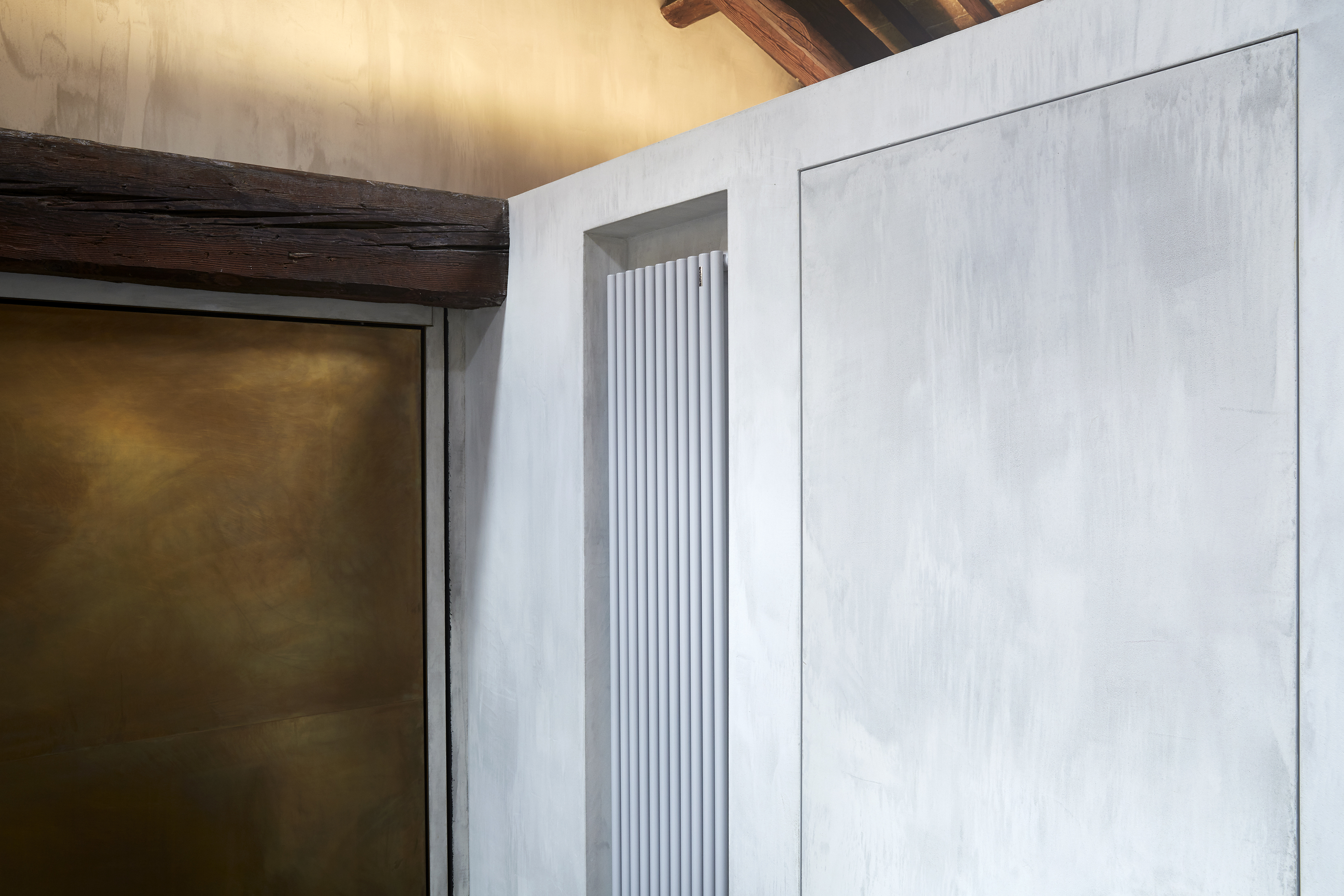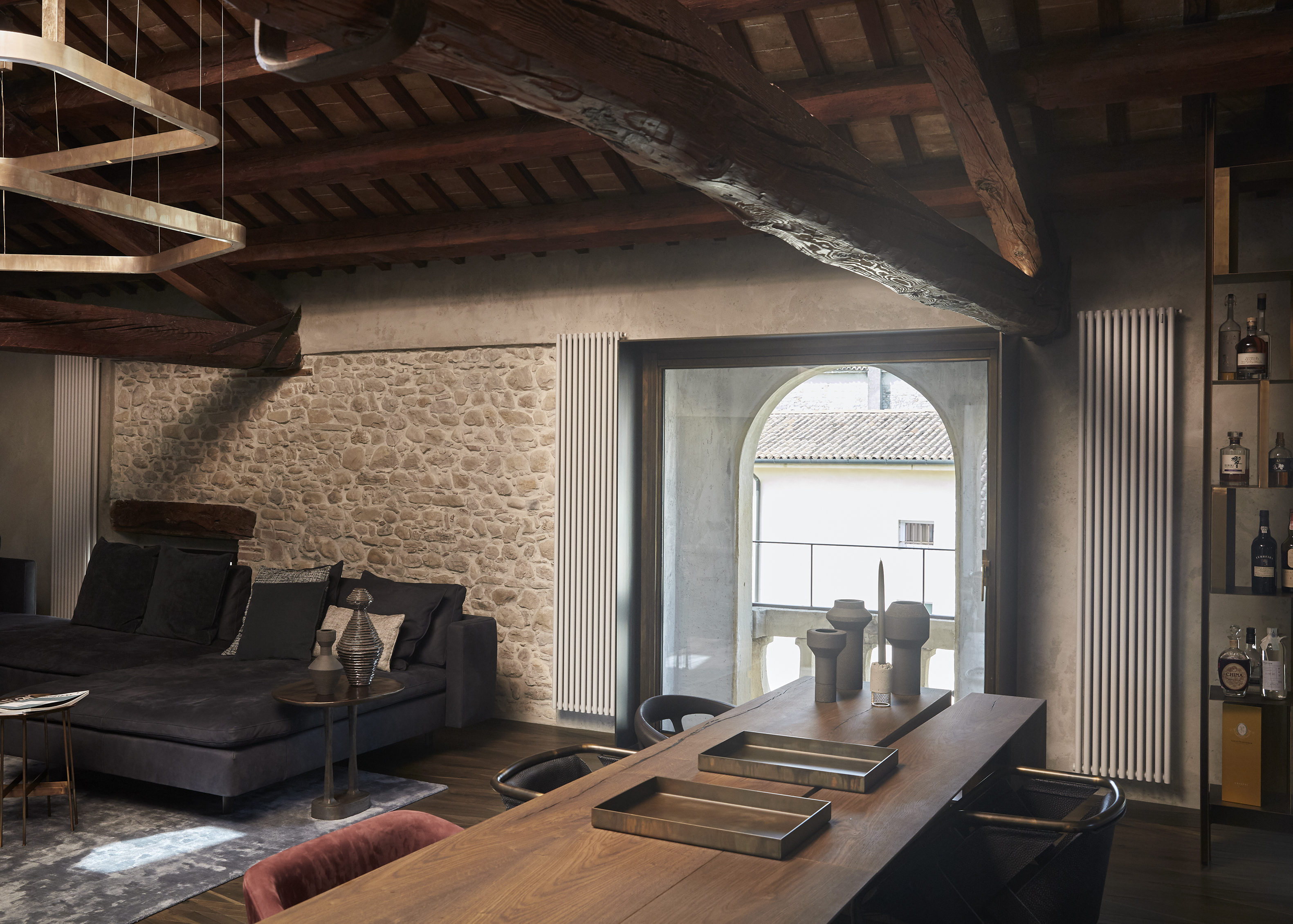 I caloriferi Tubes spiccano con personalità tra capriate lignee e travi grezze, pannelli di ottone brunito, diamanti a doghe del pavimento in legno tagliato al laser e originali finestre ad arco palladiano. Caratteristica del prodotto, scelto all’interno della collezione Basic di Tubes ma customizzato per questo progetto, è la grande pulizia estetica, ottenuta grazie all’assenza di valvole, generalmente presenti in questa linea di radiatori. La modifica è stata resa possibile da una particolare saldatura studiata dal reparto ricerca e sviluppo di Tubes, in modo da spostare gli attacchi posteriormente.