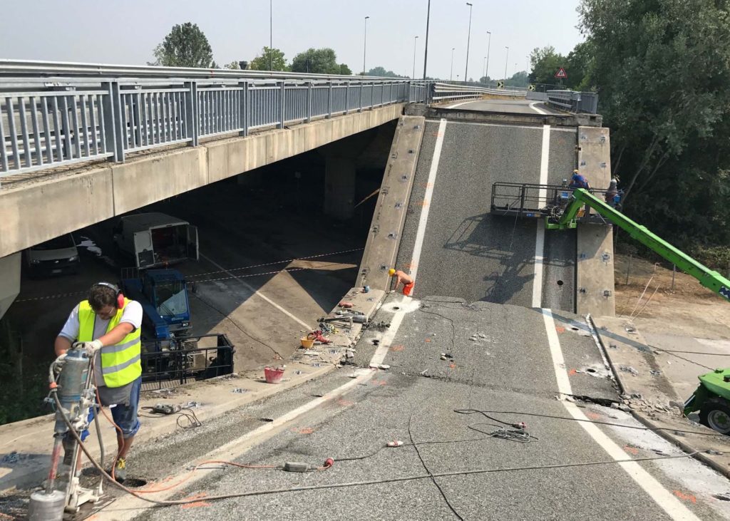 Dopo il crollo improvviso di una parte della Tangenziale di Fossano lo scorso aprile, c’era bisogno di un importante intervento effettuato con la tecnica della demolizione controllata in partnership con Tyrolit. Le parti di ponte crollato andavano velocemente rimosse, soprattutto per permettere l’installazione di un sistema di monitoraggio strumentale sulle 114 campate della struttura, anche con prove di carico. L’Anas ha quindi interpellato uno studio di ingegneria – la società SAISEF – Società Anonima Imprese Stradali e Ferroviarie di Mondovì (CN) – che ha provveduto alla realizzazione di una dettagliata relazione tecnico-scientifica che doveva prevedere la rimozione dei pezzi di ponte senza che questi si sbriciolassero, un elemento fondamentale per permettere le analisi strutturali da parte dei tecnici dell’Anas.