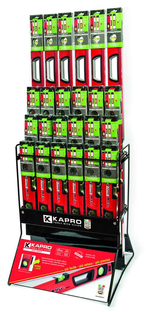 L’offerta delle livelle Kapro proposta da Ullmann è completa di altri 6 modelli: Serie 787 Spirit Level classiche e magnetiche in 9 misure, le serie 920 Shark Level DW e 730 TopCast Level con corpo trapezoidale in alluminio per carpentieri, le ToolBox Level 923 DW e 227 Level compatte e maneggevoli, la Handy Level 246 supercompatta tascabile con fiala di alta precisione. Sono inoltre previsti espositori da terra in metallo che contengono gamme complete per massima visibilità delle livelle nel punto vendita.