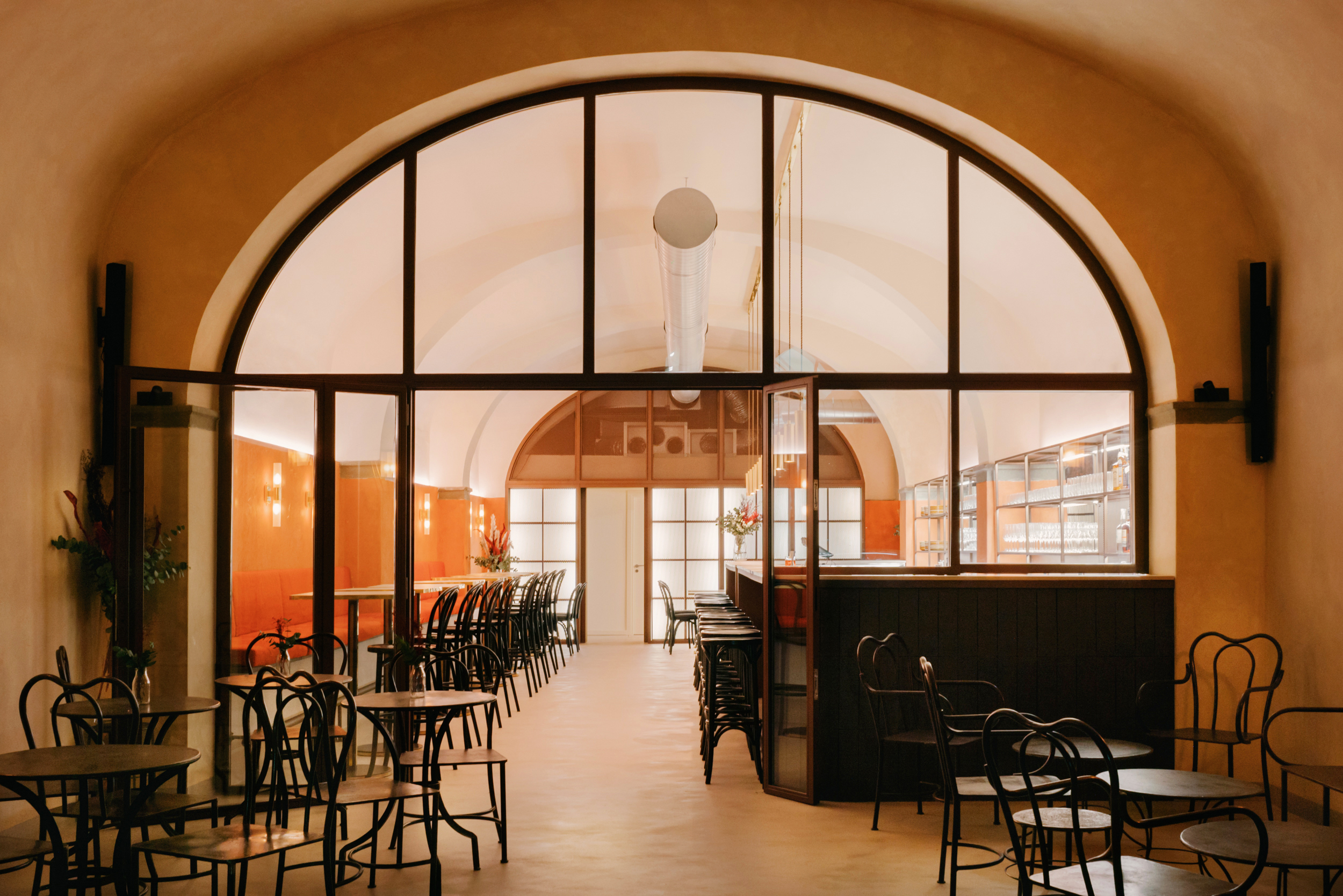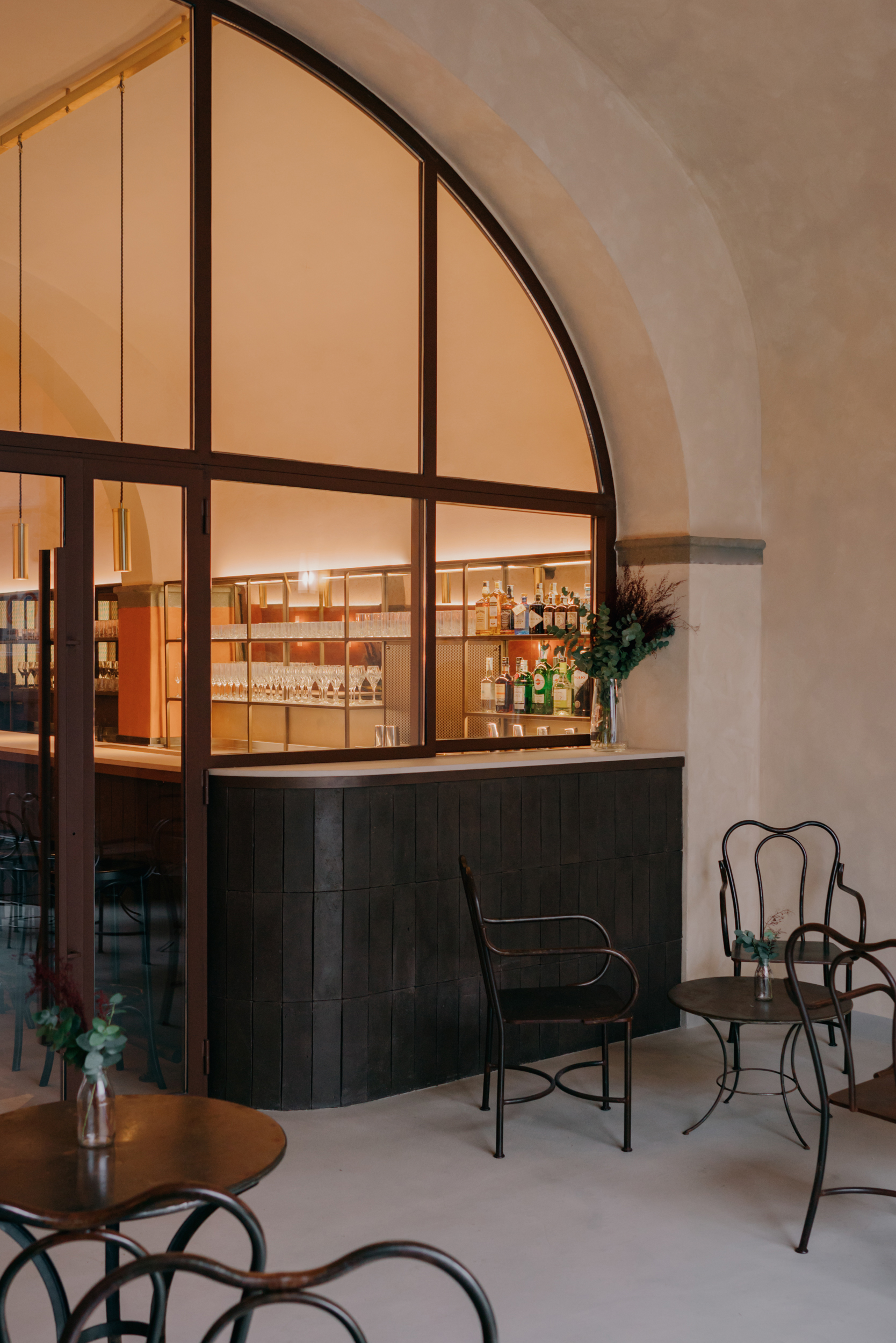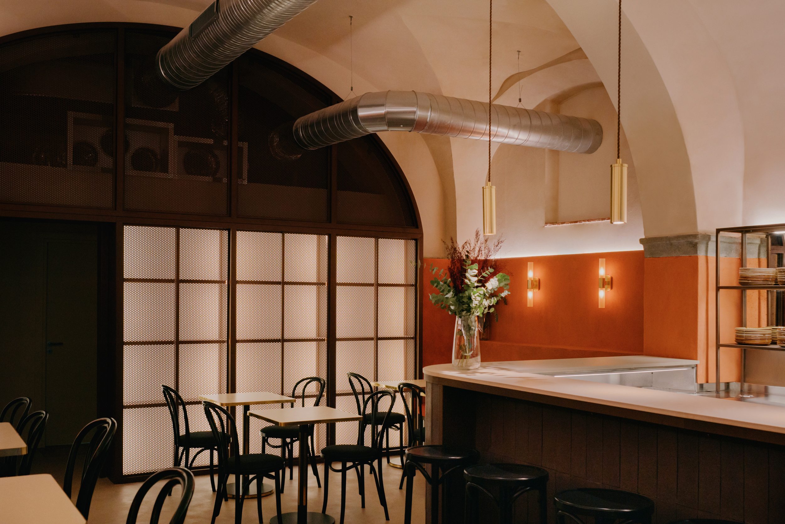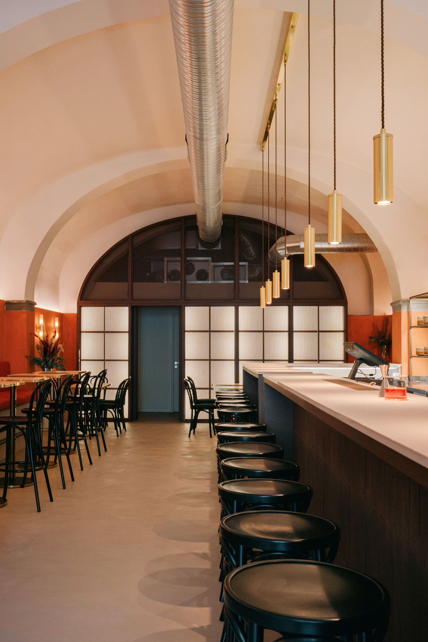 La vetrata d’ingresso è centinata, con infissi in metallo scuro progettati per aprirsi facilmente verso l’esterno ed eliminare la barriera tra interni ed esterni. Data la pianta lunga e stretta, il nuovo progetto ha scelto di sottolineare questa spinta verso la longitudinalità con strategiche soluzioni: sul culmine della volta, per esempio, è lasciato bene in vista il tubo in acciaio che racchiude gli impianti tecnici e il sistema di termoregolazione, creando una sorta di lunga spina dorsale.