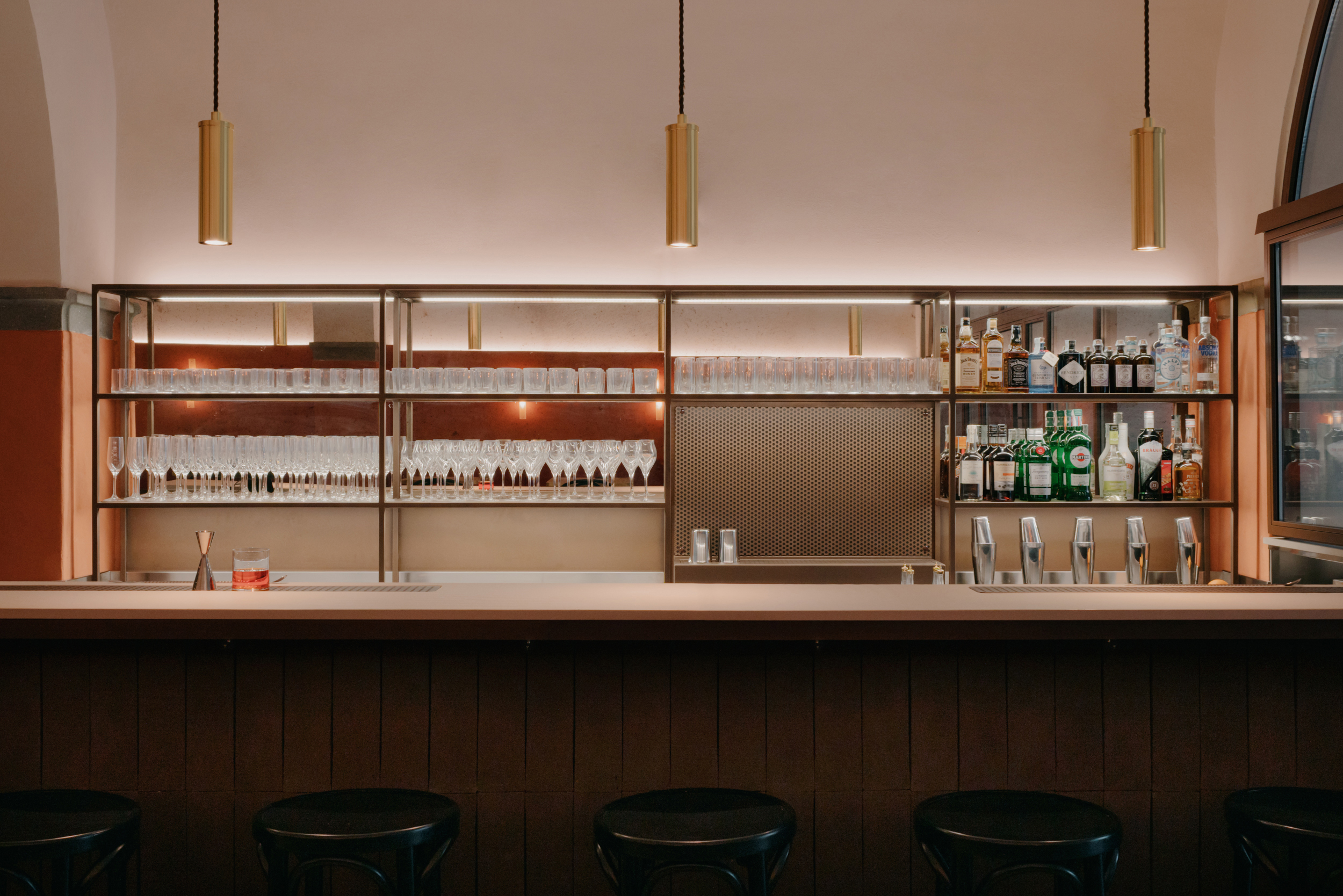 I muri, con i lori inevitabili segni del tempo, sono stati risanati e poi lasciati a vista, senza coprirli con accessori e rivestimenti ma solo tinteggiati in due colori. Una scelta decisa per richiamare il passato storico del locale, come spiegano i progettisti «tinteggiature a calce, terracotta nera e ottone spazzolato garantiscono un’atmosfera accogliente e delicata che accompagna i clienti nei sapori della miscelazione senza sopraffarli».