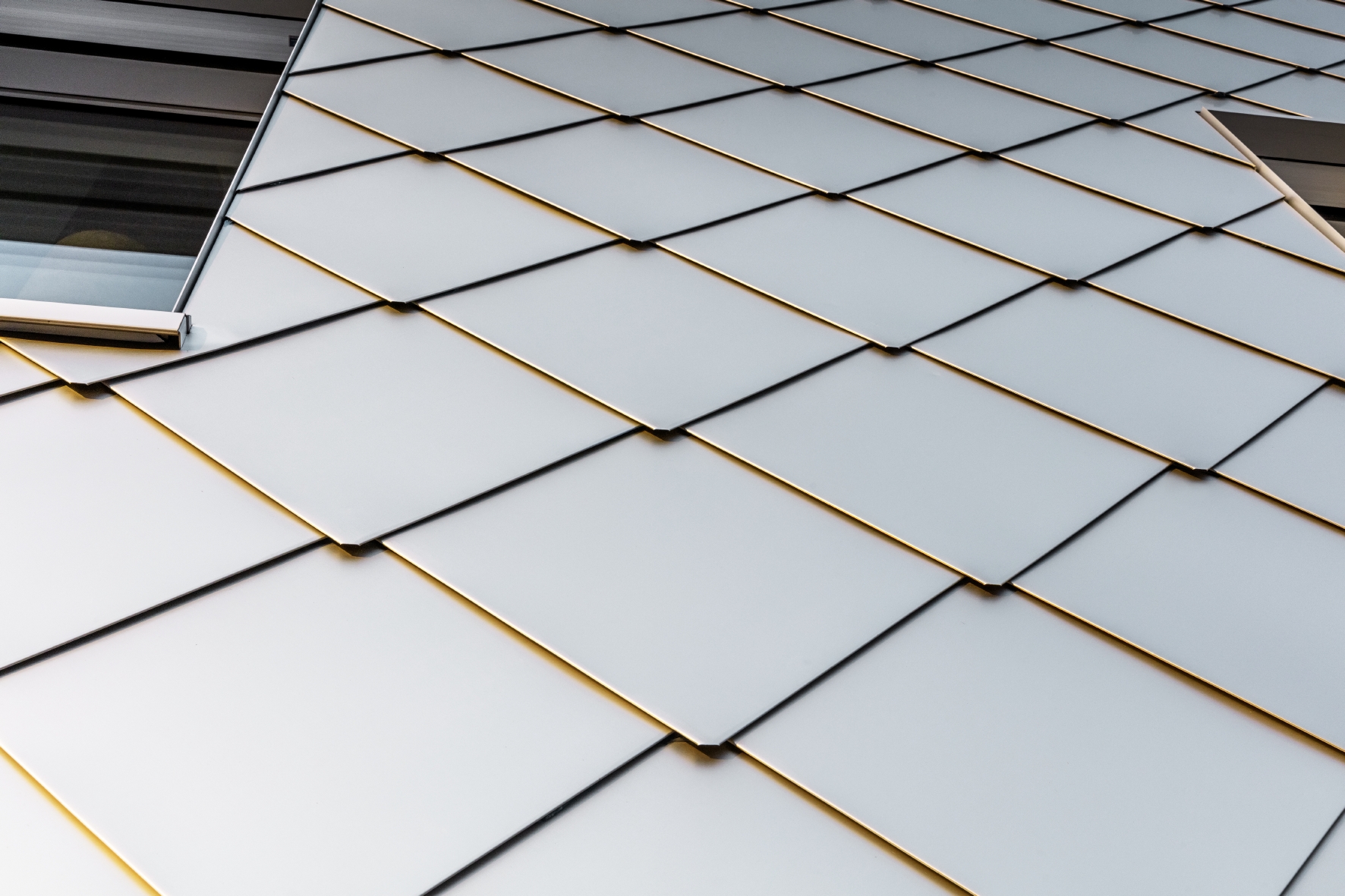 La seconda caratteristica d’impatto della facciata è il suo materiale: scaglie 44 × 44 in alluminio. Riflettendo l’ambiente circostante sulla superficie anodizzata dell’alluminio naturale, lasciano intuire quel che accade intorno e rispecchiano le nuvole e i loro spostamenti nel cielo. Un’altra peculiarità sono gli spigoli sporgenti. Partendo dall’ingresso, che bisognava far risaltare, le Scaglie si arrampicano lungo la facciata fino al tetto, che si fonde con la facciata a formare un tutt’uno.