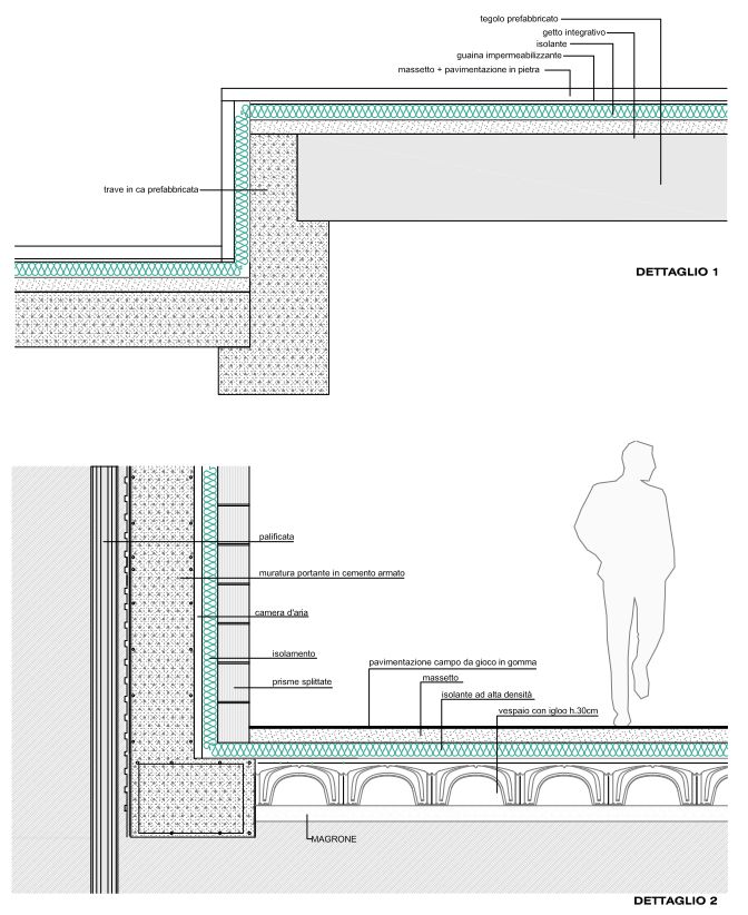 Le scelte dei particolari costruttivi sono state guidate anche dalla volontà di ottenere un basso impatto paesaggistico e un’elevata capacità di dialogare con i luoghi circostanti. Attraverso ampie vetrate continue si è ricreata la trasparenza e la permeabilità, quantomeno visiva, precedente alla realizzazione della palestra; il luogo dello sport è partecipe della vita della corte e ne diventa protagonista e motivo d’incontro. L’edificio dell’altezza utile interna di 7.20 m, come prescritto dai regolamenti specifici per le gare di basket, ha una superficie di circa 700 mq ed è adiacente alla palestra attualmente esistente e utilizzata dall’Istituto Vittorio Emanuele II; lo spazio di risulta fra la palestra esistente e quella nuova, è utilizzato per il passaggio degli impianti tecnologici.