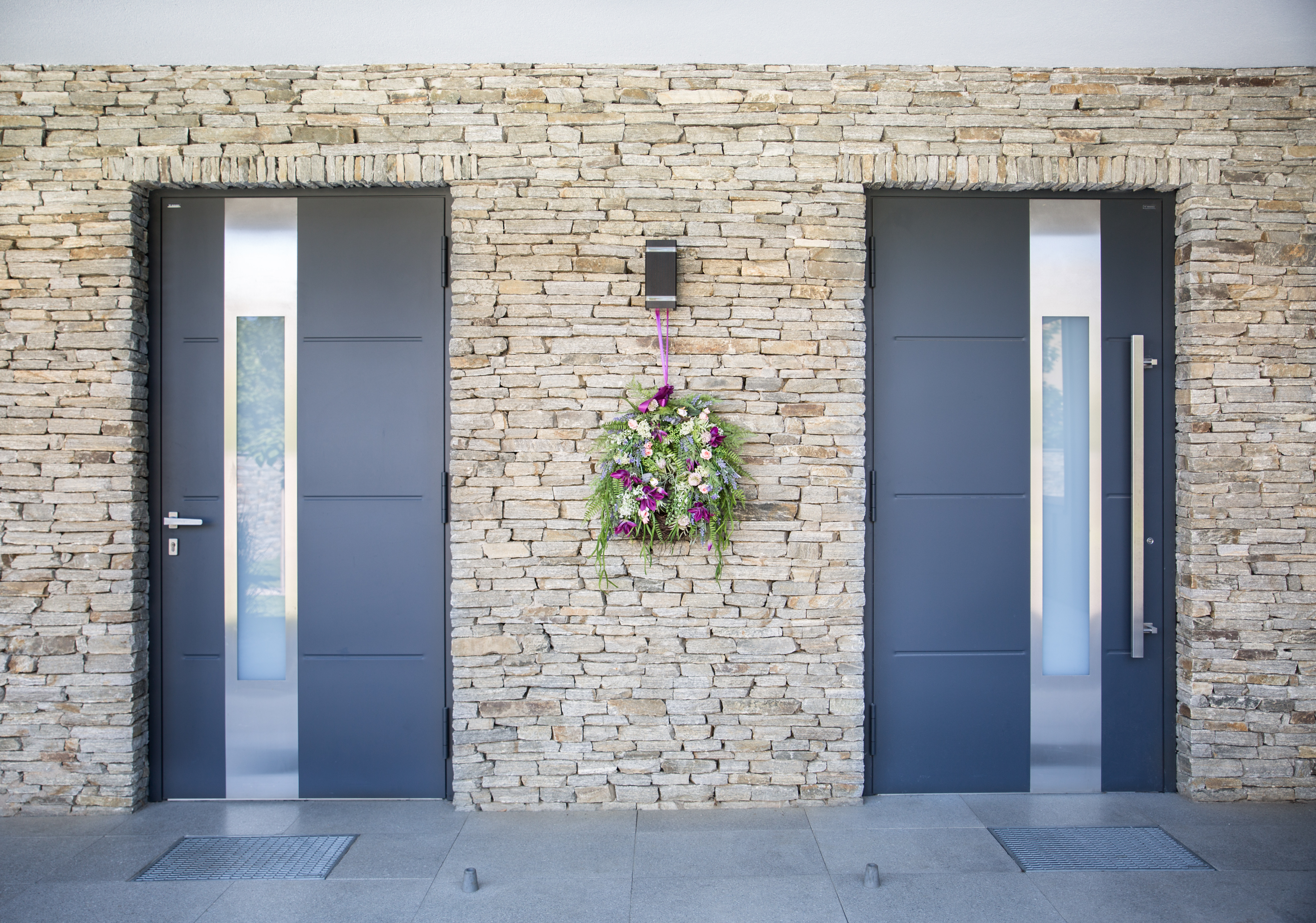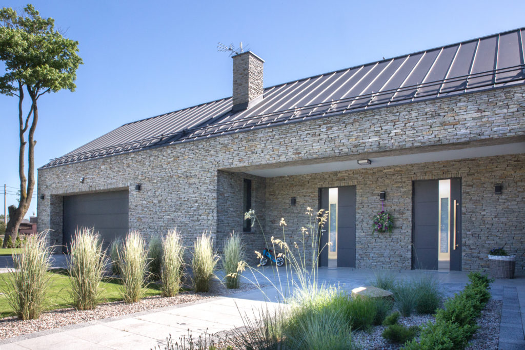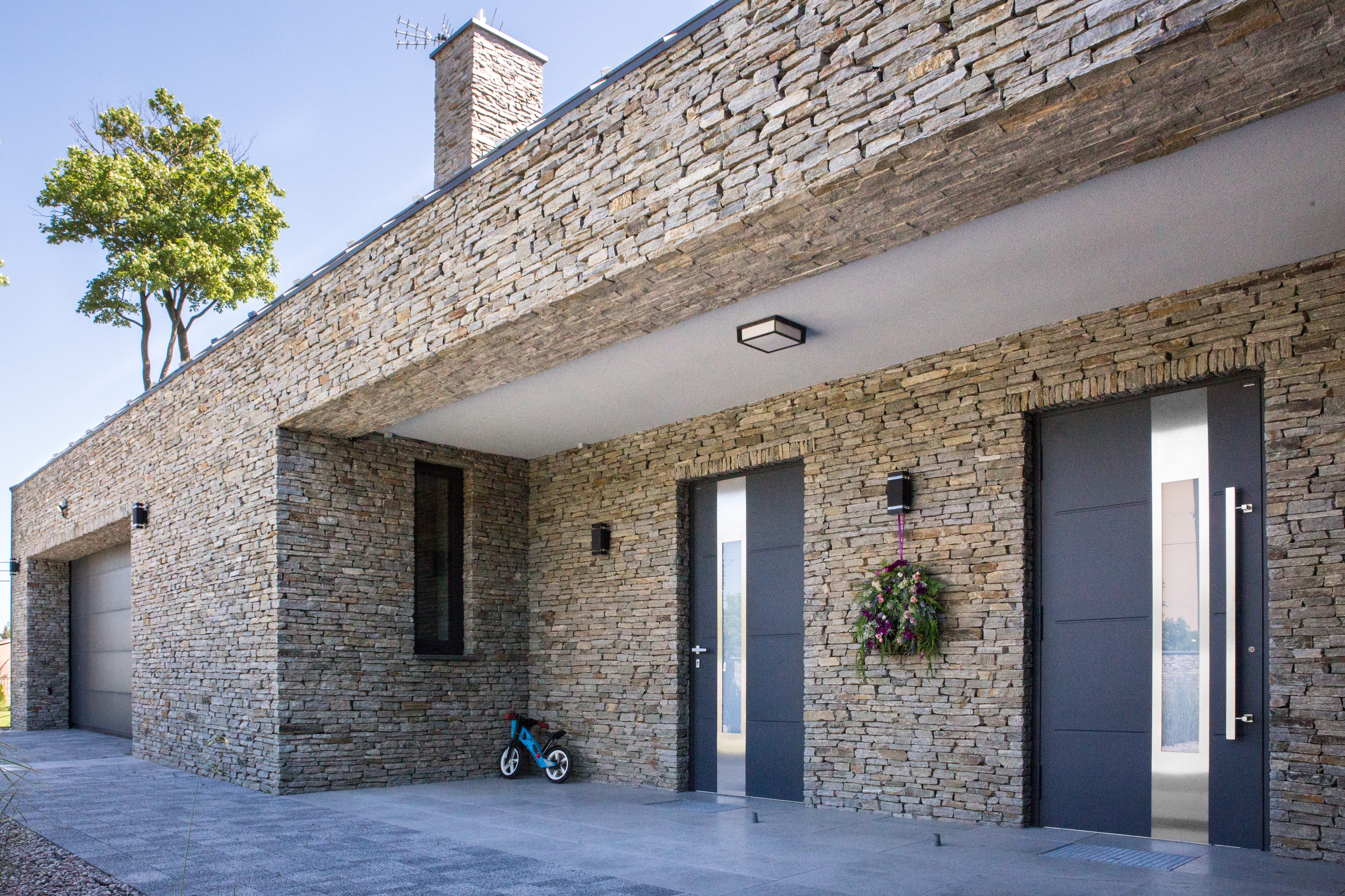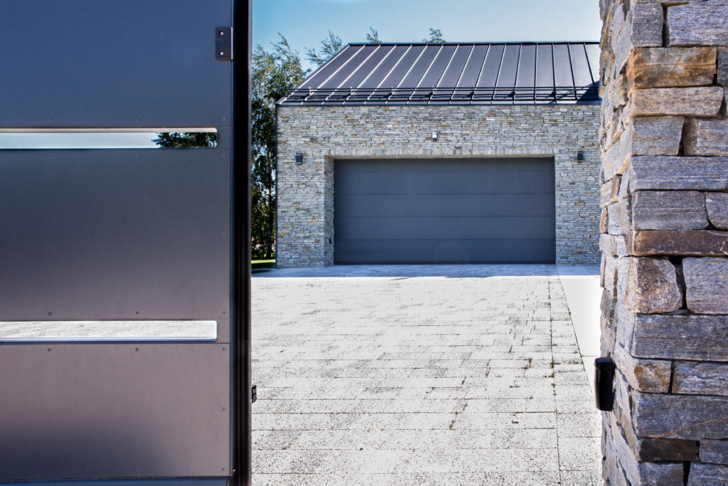 In un simile contesto sia l’architetto che il committente erano fino da subito consapevoli che la preferenza sarebbe andata verso l’uso di materiali che esprimessero naturalità. Per questo si è deciso di fare la facciata con pietre a vista e di realizzare in pietra naturale anche la recinzione. In questo contesto che quasi sembra quello di una costruzione al grezzo spiccano invece con il loro grigio antracite, così attuale, sia la copertura del tetto quanto i portoncini di ingresso, il portone del garage ed il cancello della recinzione.