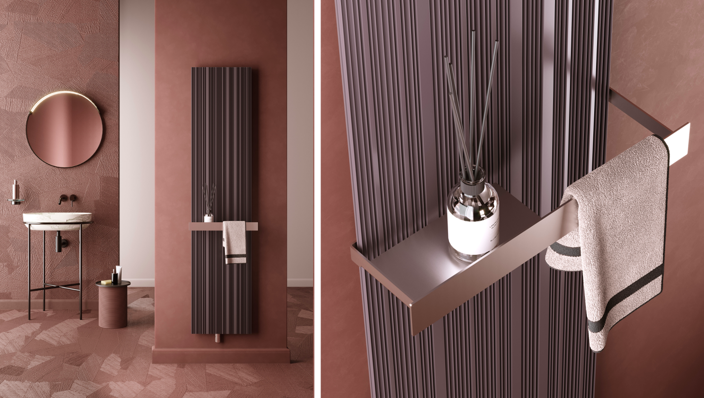 Il progetto nasce quasi in simultanea con un interessante sistema di accessori minimalisti; mensole e barre di appenderia non vengono rilegati, come di solito avviene, a meri elementi accessori ma si integrano perfettamente con il disegno del termoarredo, tanto da diventare un “unico” con il prodotto stesso. Il segno che li caratterizza è l’estrema leggerezza legata all’uso di sezioni ridottissime; interessante inoltre il sistema di aggancio libero che permette all’utente finale di disporli a suo piacere lungo tutta la verticale del prodotto.