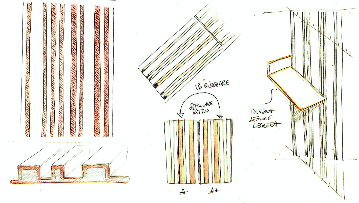 Tutti i dettagli sono stati disegnati accuratamente. Inizialmente il ritmo è stato volutamente progettato in modo casuale; una volta realizzati i prototipi in scala 1:1 Marco Pisati ha trovato la giusta proporzione tra lamine in alluminio e scanalature in modo da creare un ritmo corretto di ombre e riflessi.
