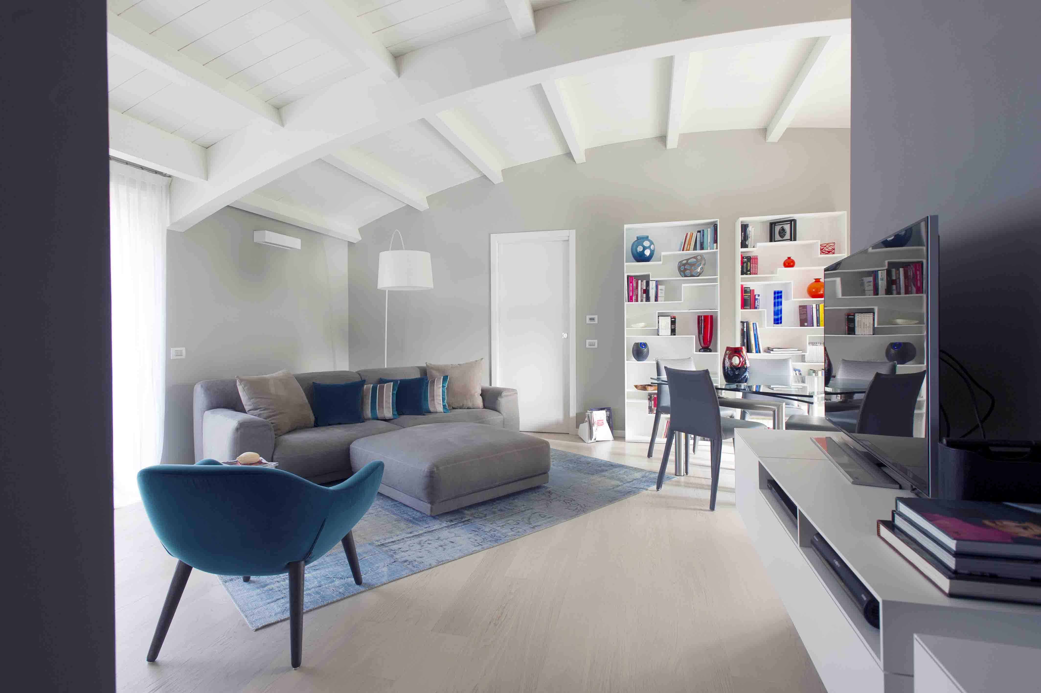 L’appartamento è suddiviso in cucina, zona living, una camera da letto, due bagni (uno in suite e un secondo di servizio), una cabina armadio (ricavata nella seconda camera da letto) e un piccolo ripostiglio. Lo stile scelto dai committenti è minimal ed essenziale, con un importante utilizzo del legno sia per il rivestimento del pavimento (rovere tinto in tutta la casa), sia a soffitto. Uno degli elementi architettonici più suggestivi e di maggiore impatto visivo è infatti la curvatura delle travi a vista del soffitto presenti in tutta casa, verniciate di bianco per rendere più omogeneo l’ambiente (viste le diverse essenze di legno presenti) e per dare un più ampio respiro in altezza.