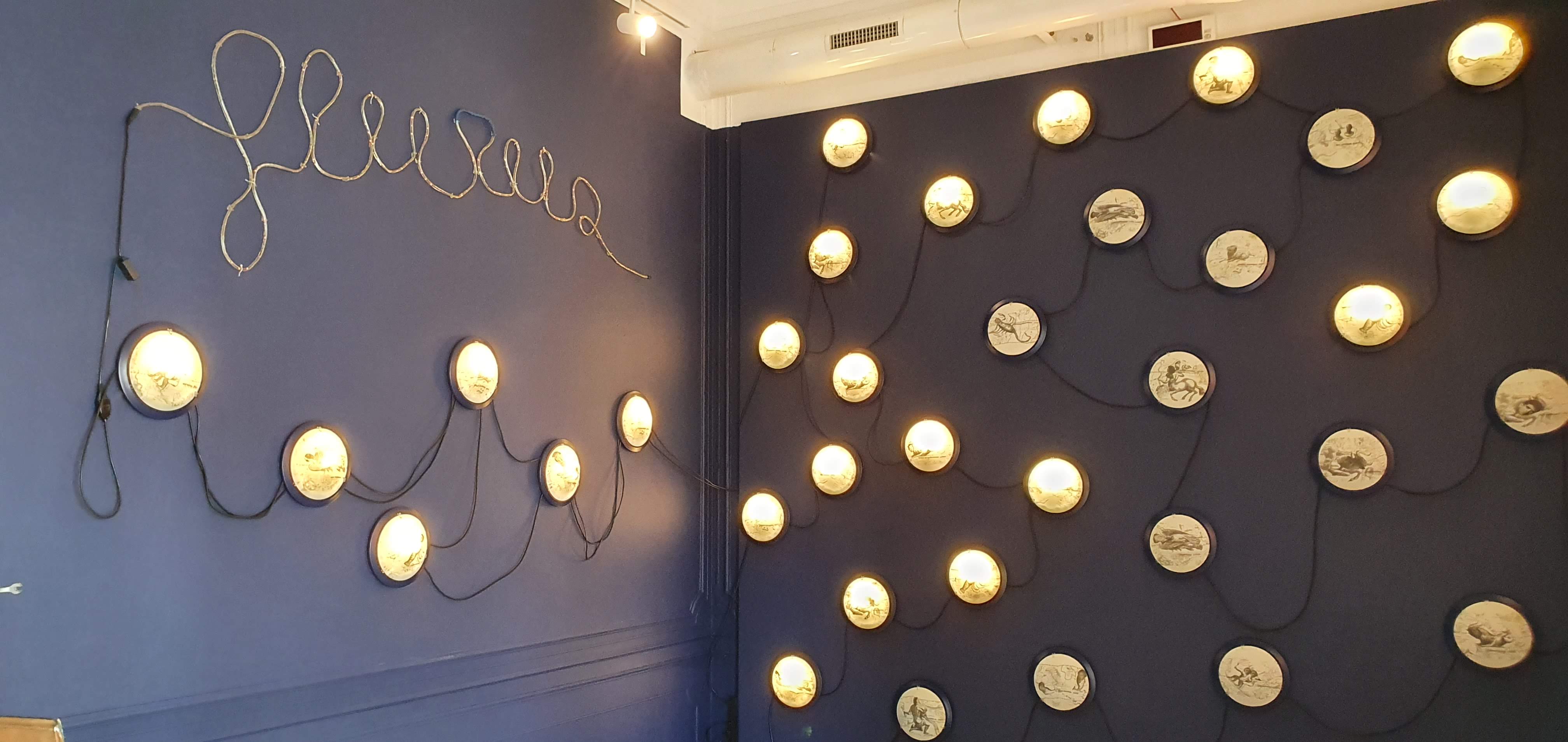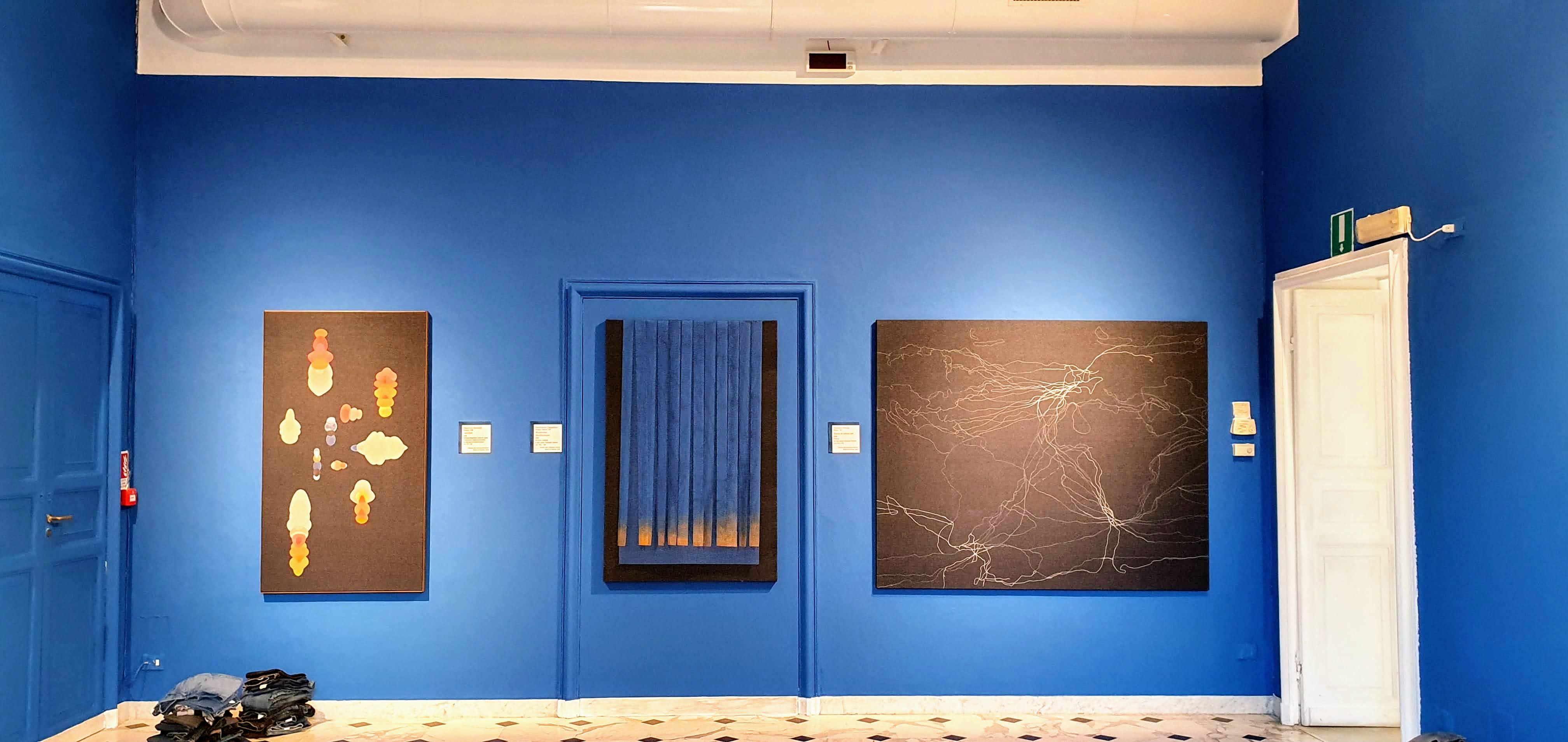 «Il blu è un colore meraviglioso, ricco di fascino e pieno di suggestioni. Abbiamo scelto blu diversi a seconda del mood che ciascuna sala e ciascuna delle cinque esposizioni di questa mostra plurima dovevano trasmettere. La notte stellata della sala dedicata al movimento Fluxus non poteva essere altro che un blu notte, intenso e capace di tramettere la sensazione del buio, che si accende ad intermittenza con la costellazione e le fluorescenze dell’opera di Ben Patterson. Il blu cobalto è stato scelto per la sala conclusiva del percorso espositivo per lasciare quel sentore di grande positività e di emotività al nostro visitatore. Il bianco panna è un colore delicato, forse l’unico capace di convivere con le importanti pareti affrescate delle sue sale a piano terra decorate nell’Ottocento per l’elegante dimora della famiglia Croce, oggi Museo d’Arte Contemporanea della nostra città.» Anna Orlando