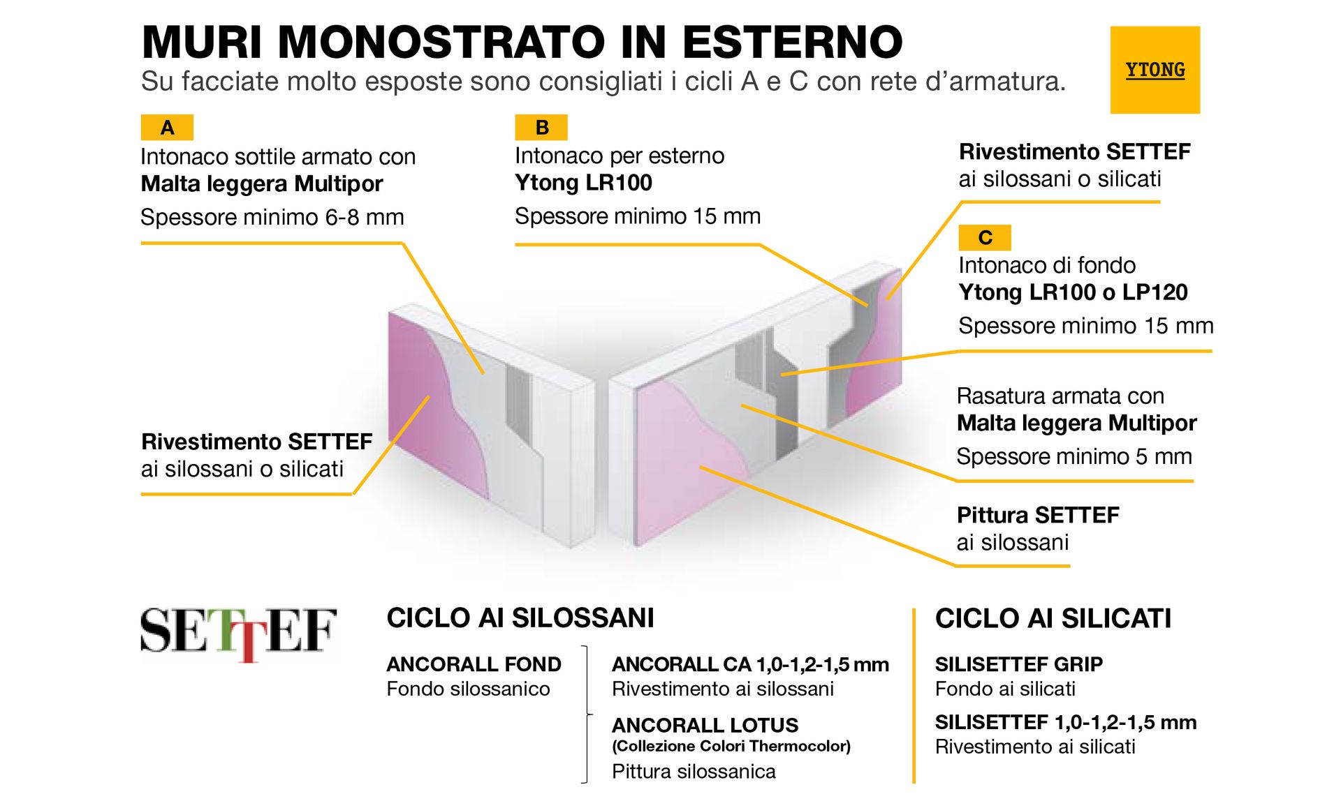 1. Cicli per esterno Ytong – Settef e Multipor – SettefIl ciclo per esterno prevede l’applicazione, su murature in blocchi a bassa densità Ytong, rivestiti con intonaco Ytong LR100, di: