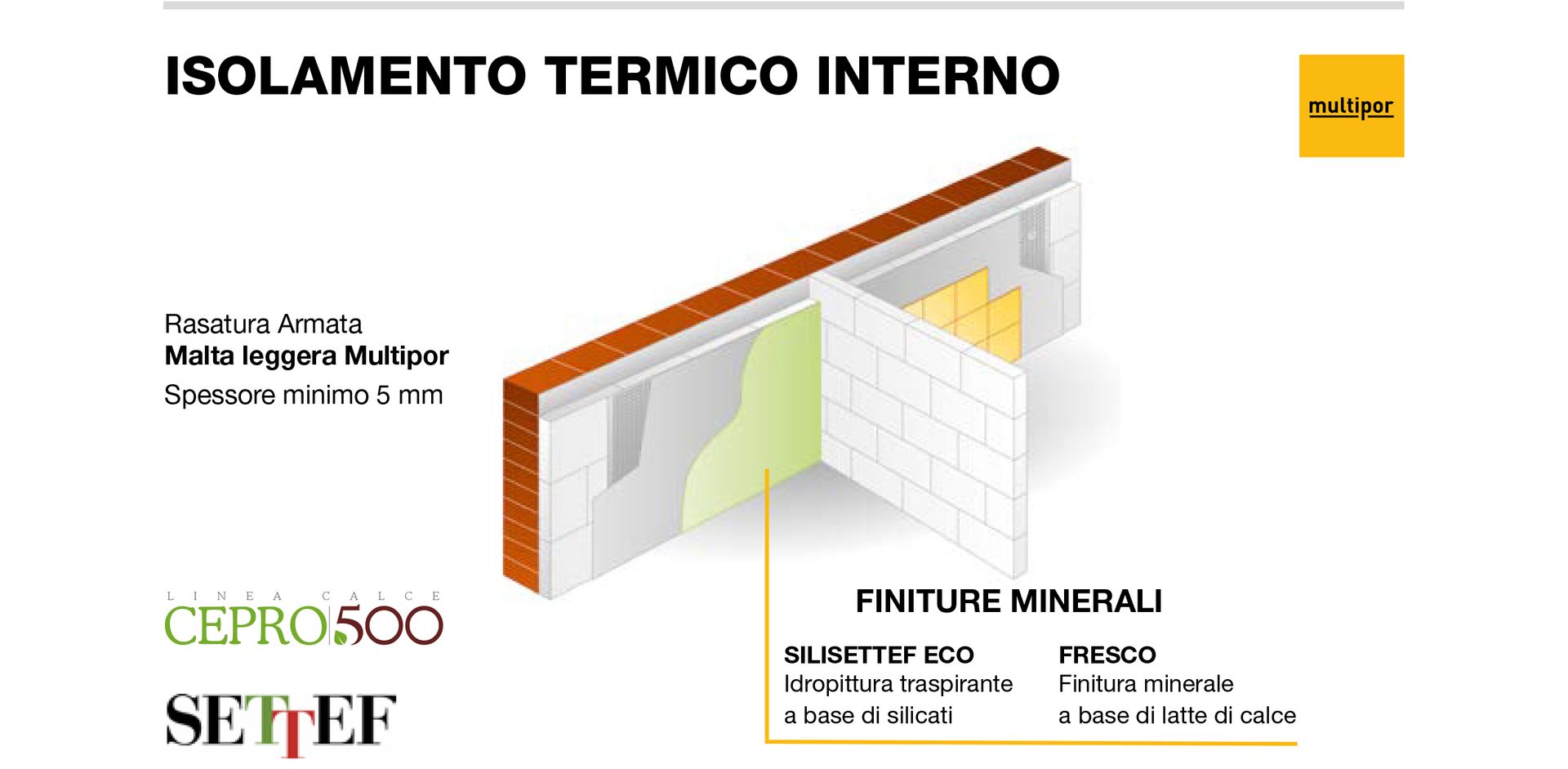 Per quanto riguarda i cicli per interno sviluppati da Settef e Xella, le combinazioni possibili coinvolgono i sistemi di isolamento termico Multipor di Xella in combinazione con Fresco, il tinteggio minerale Cepro a base di latte di calce e Silisettef Eco, idropittura traspirante ai silicati.