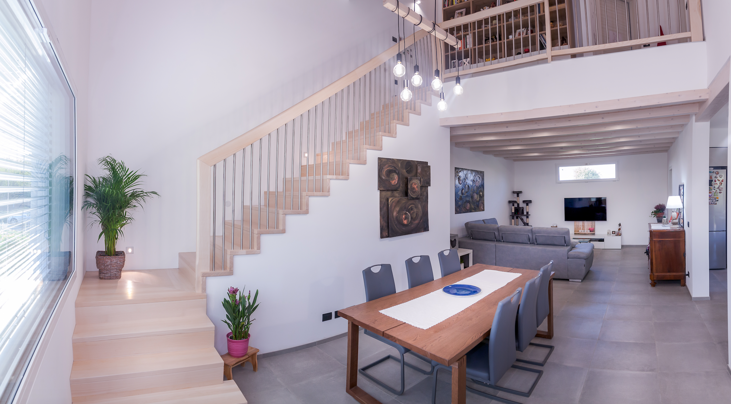 Il desiderio dei committenti di creare un forte legame con la natura circostante si è poi tradotto in ampie finestre e vetrate – che si aprono sul panorama e che infondono luminosità agli ambienti – protette da raffstore adeguatamente studiati per ottimizzare il flusso di luce solare interno. Un dettaglio progettuale che consente un dialogo tra l’edificio e la campagna circostante, ricca di vigneti, frutteti, piccoli boschi e distese erbose. Questa scelta architettonica non doveva però compromettere l’efficienza energetica del progetto, pertanto Vario Haus ha optato per serramenti in PVC con triplo vetro basso emissivo (Ug=0,5 W/m2°K, Uw=0,72 W/m2°K), che garantiscono le massime prestazioni e la migliore durata nel tempo.