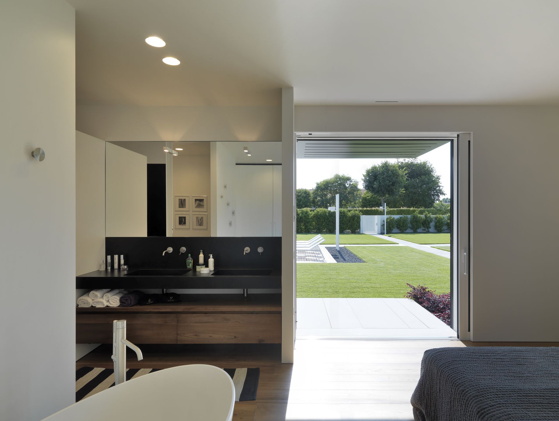 La soglia 0-level di tutti gli accessi all’abitazione, perfettamente a filo pavimento, sono poi il punto di forza sia estetico che funzionale, garantendo un passaggio continuo e senza ostacoli tra un locale e l’altro.
