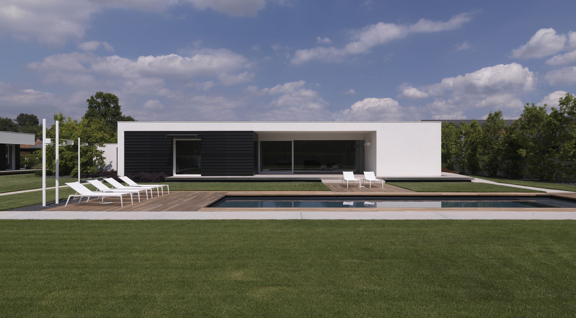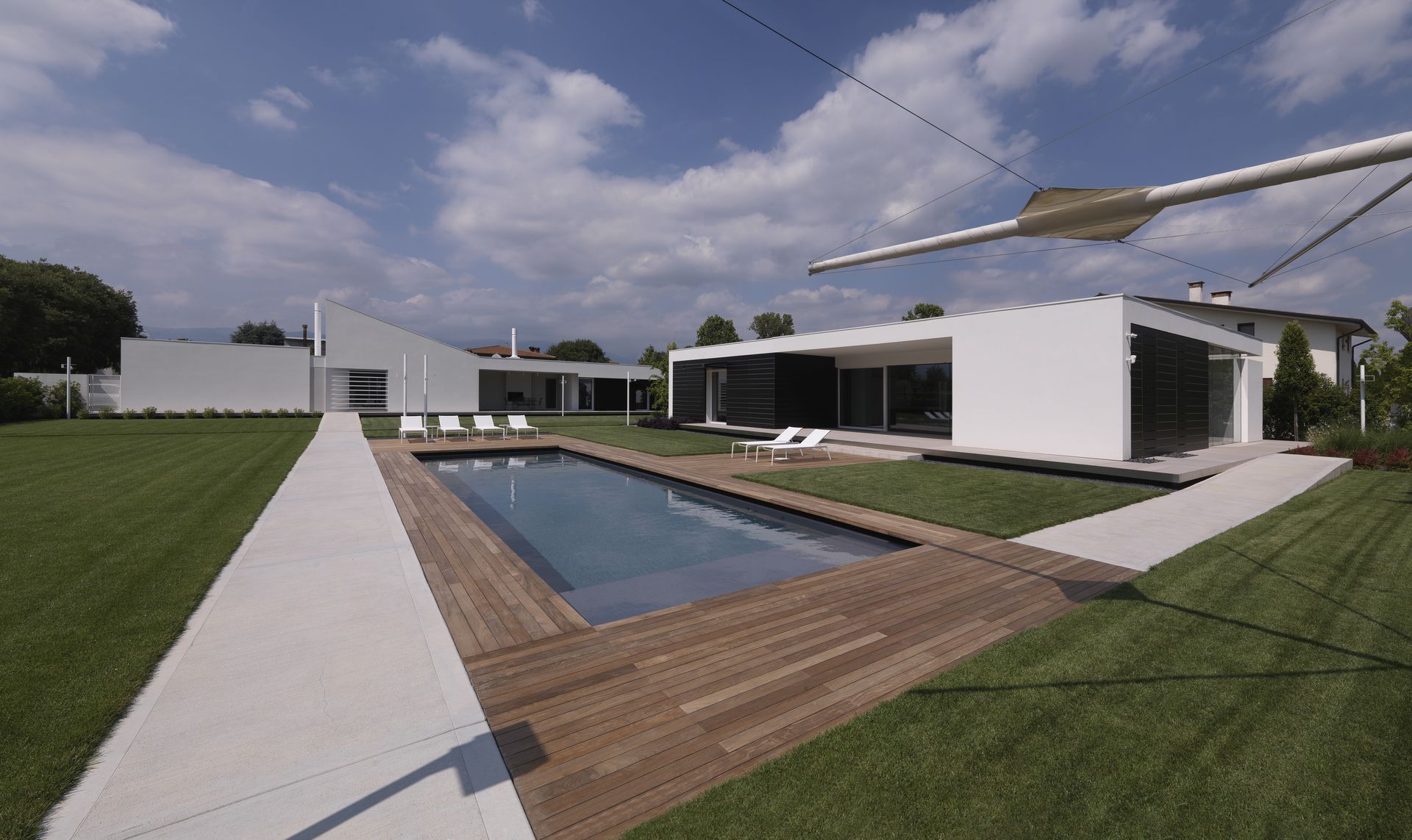 Il tutto con un occhio di riguardo alla sostenibilità ambientale: gli edifici sono infatti in classe A. Il complesso così ottenuto ha una forma a C, con una sorta di “punta” che chiude verso nord quasi a simulare un “abbraccio” che protegge e unisce i due nuclei familiari; geometrie precise e pulite, che hanno consentito di studiare appositi percorsi accessibili nel giardino interno, con anche la piscina.