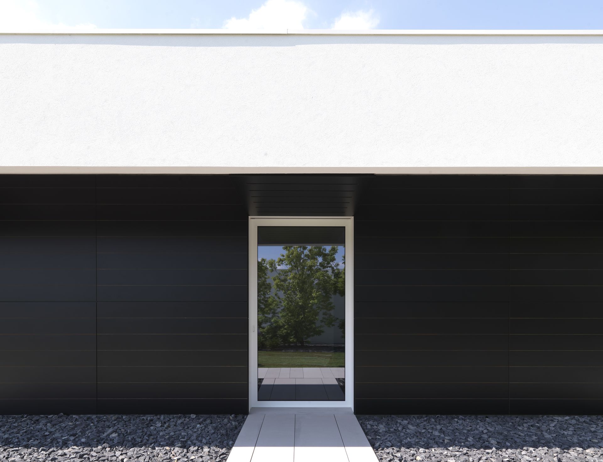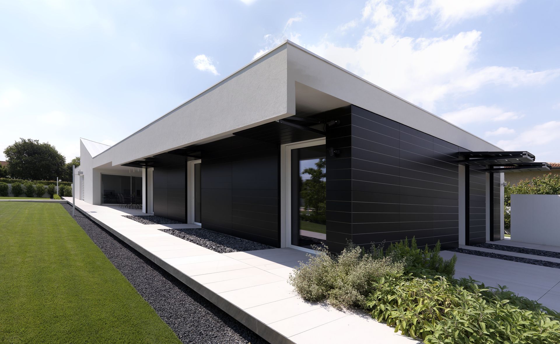 All’esterno, gli scuri a ginocchio, una volta chiusi occultano i fori e danno continuità ai volumi. Esattamente come la porta d’ingresso in alluminio Schüco ADS 75.HD, che si integra alla perfezione con la parete d’ingresso, per un effetto estetico di uniformità.