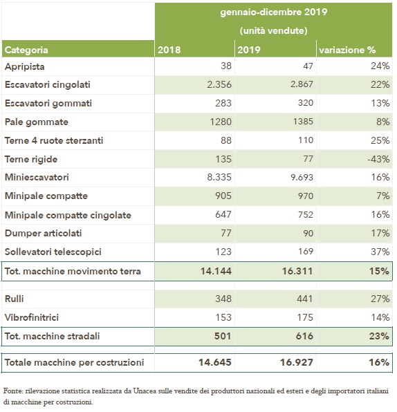 Nel 2019 sono state immesse sul mercato italiano 16.927 macchine per costruzioni, con una crescita del 16% rispetto al 2018: è questo il dato che emerge dall’ultima rilevazione condotta da Unacea. In particolare, sono 16.311 le macchine movimento terra vendute, con una crescita del 15%, e 407 le macchine stradali, che registrano invece un incremento del 23%.