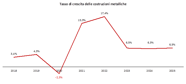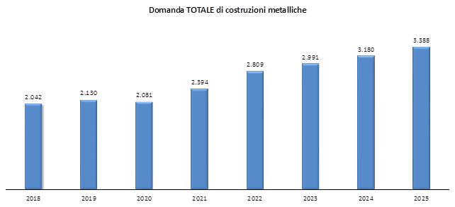 Nel 2023 la domanda di costruzioni metalliche ha sfiorato i 3 miliardi di euro, nel 2024 supererà ampiamente i 3,1 miliardi di euro, arrivando a circa 3,4 miliardi nel 2025. Nel 2024 la domanda di costruzioni metalliche delle infrastrutture sfiorerà i 2 miliardi di euro, i lavori nel segmento non residenziale (logistica, terziario avanzato ed edifici pubblici) genereranno una domanda di oltre 1,2 miliardi di euro. Per il 2025 e 2024 si prevede che entrambi i segmenti saranno interessati da una crescita positiva, alimentata prevalentemente da investimenti pubblici.