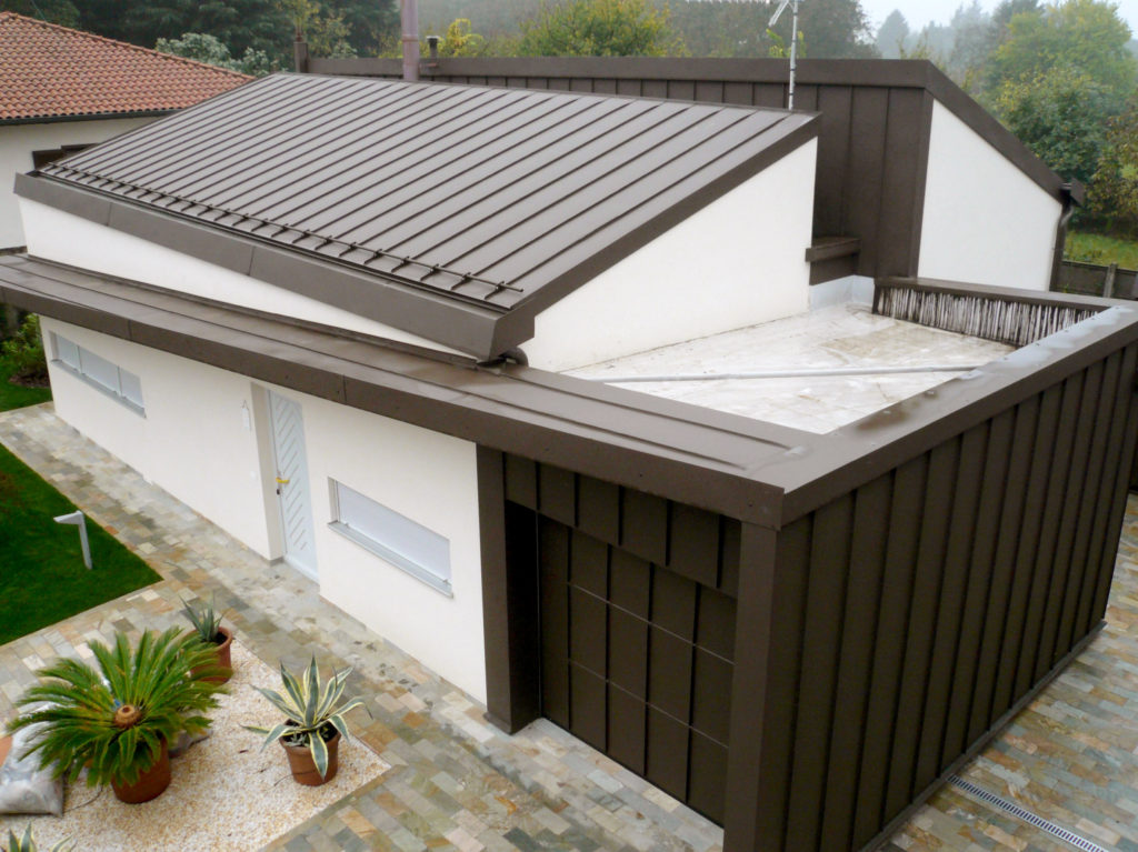 Un prodotto particolarmente versatile, concepito per essere personalizzato a seconda delle esigenze sia con rivestimenti applicati – come nel caso del rivestimento in lamiera d’alluminio verniciata a caldo, fissata in doppia aggraffatura – sia con diverse tipologie di vetrature. Il garage indipendente dall’abitazione, utilizzato come box per l’auto di uso quotidiano, dispone invece di un portone basculante Hörmann Berry N80 (larghezza 2.680 mm; altezza 2.195 mm), rifinito con il motivo 905 e dotato di motorizzazione SupraMatic E.