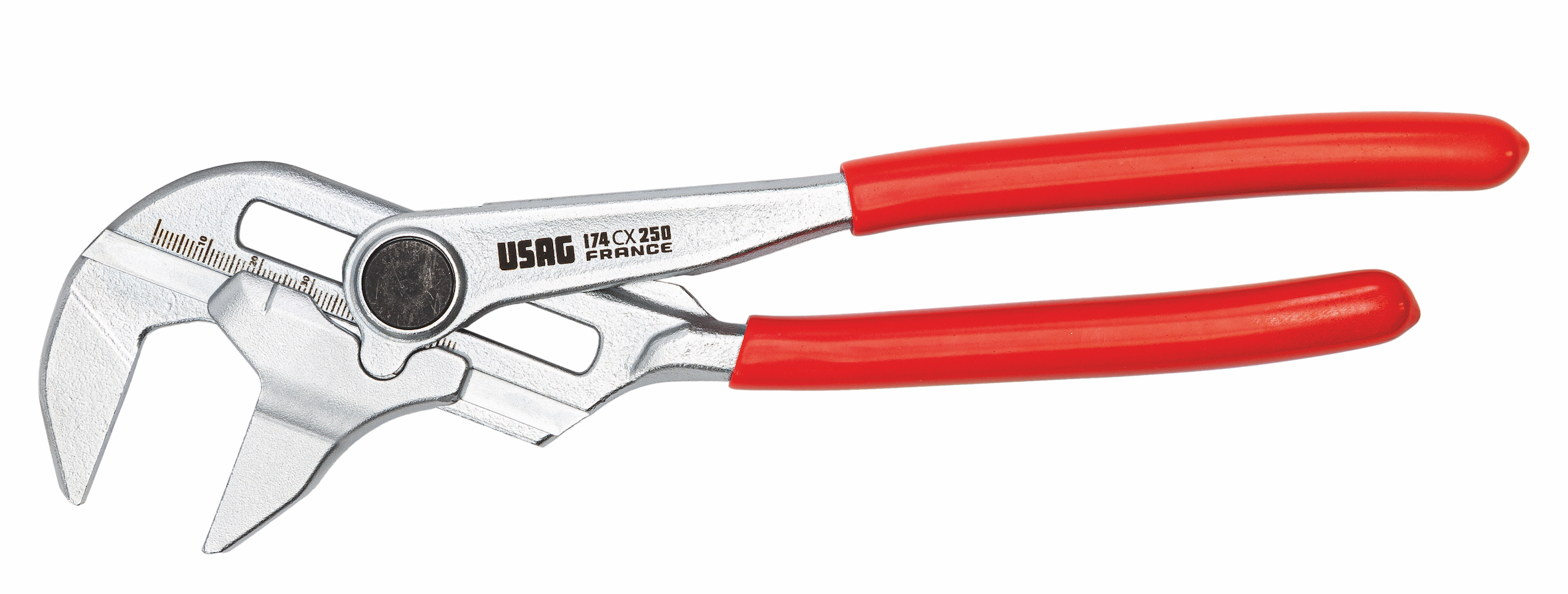 Usag presenta la nuova pinza chiave 174 Cx, uno strumento utilizzabile sia come pinza che come chiave per serrare. È lunga 25 cm, ha una capacità di apertura di 58 mm, la scala millimetrica per una regolazione precisa e una cremagliera a 20 posizioni.