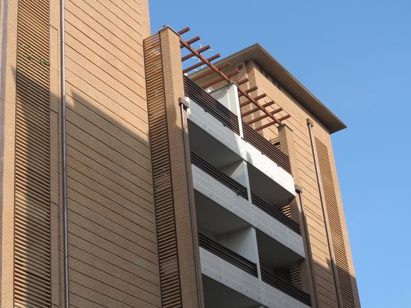 La scelta del mattone. La trama del mattone a fasce orizzontali con profondità differente, la sua qualità tattile e cromatica, la sua massività alleggerita dai pieni/vuoti delle logge parzialmente schermate da elementi frangisole in cotto, hanno permesso di mantenere un rapporto diretto con la strada e la città, creando luoghi di transizione tra lo spazio pubblico e l’intimità del privato.