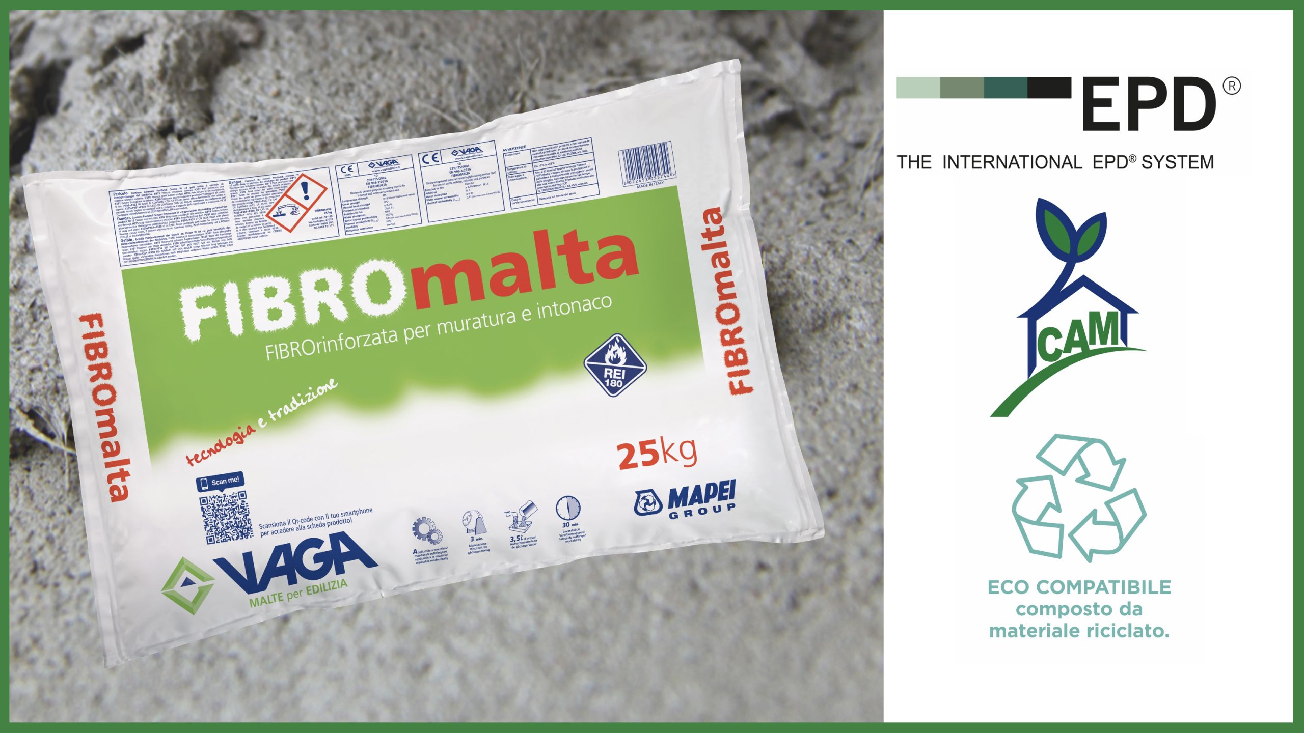«Accompagnata dalla dichiarazione di compatibilità Leed e certificata secondo i protocolli Epd, la malta speciale predosata e fibrorinforzata Fibromalta è un prodotto ecologico sostenibile che contiene nel suo mix design l’8% di aggregati ecologici di riciclo ad alte prestazioni. Vaga da sempre soluzioni innovative e tecnologiche nel mondo delle costruzioni»