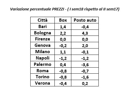 Nella prima parte del 2018 i valori immobiliari di box e posti auto, nelle grandi città, sono rimasti sostanzialmente stabili, registrando rispettivamente +0,2% e -0,1%.