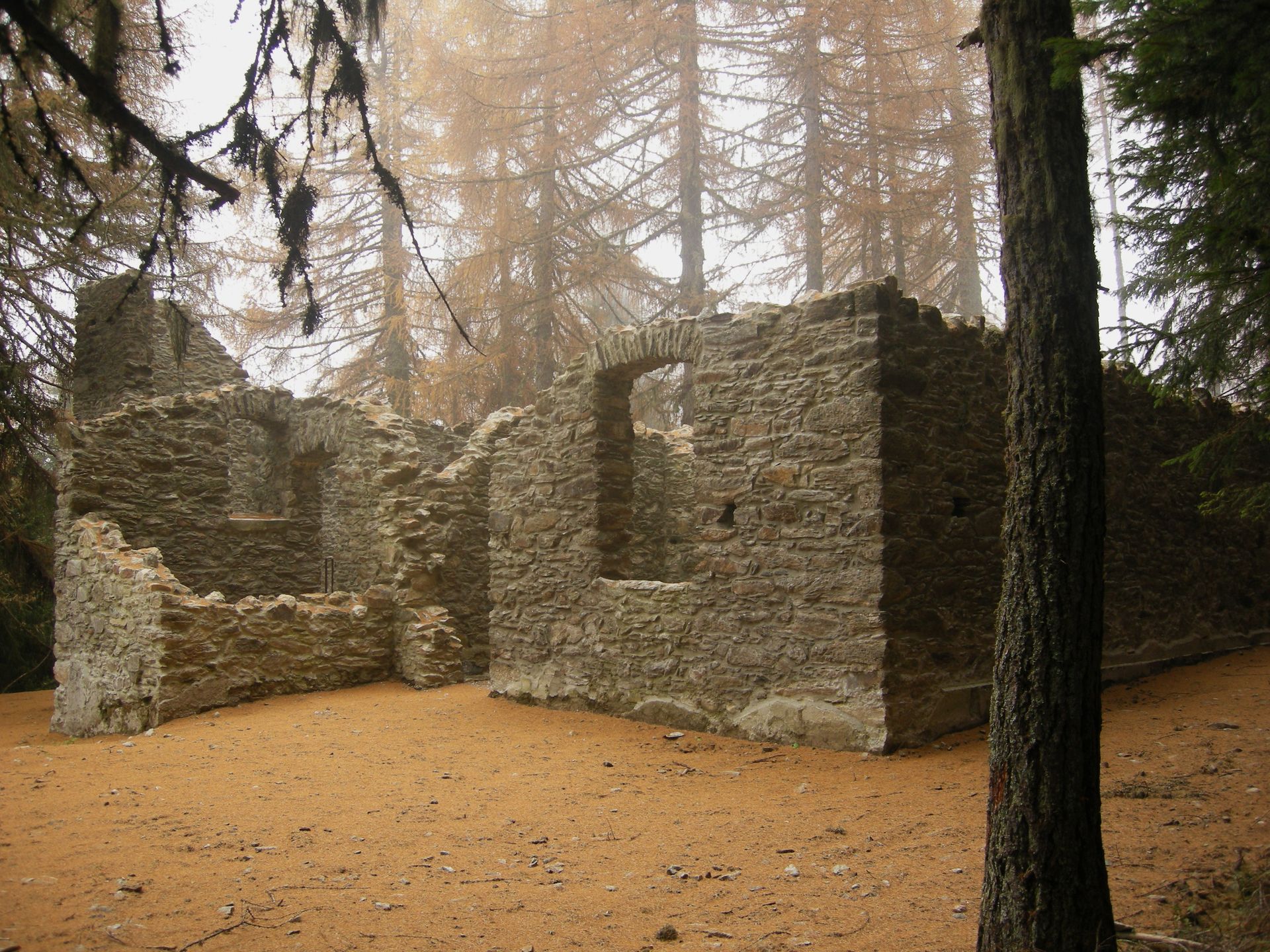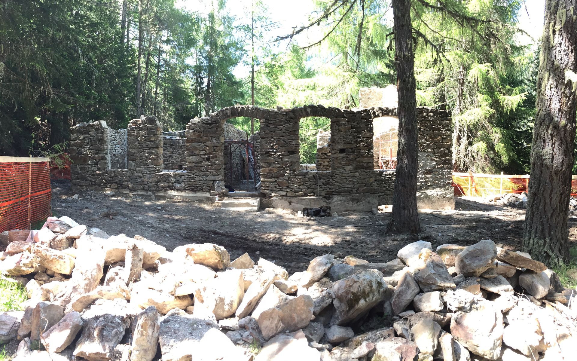 Ecco perciò che il bel lariceto cresciuto all’interno di una delle costruzioni è stato preservato, mantenendone la quota a livello superiore rispetto a quella originaria del resto dell’edificio, evidenziata dai lacerti di pavimentazione rinvenuti.