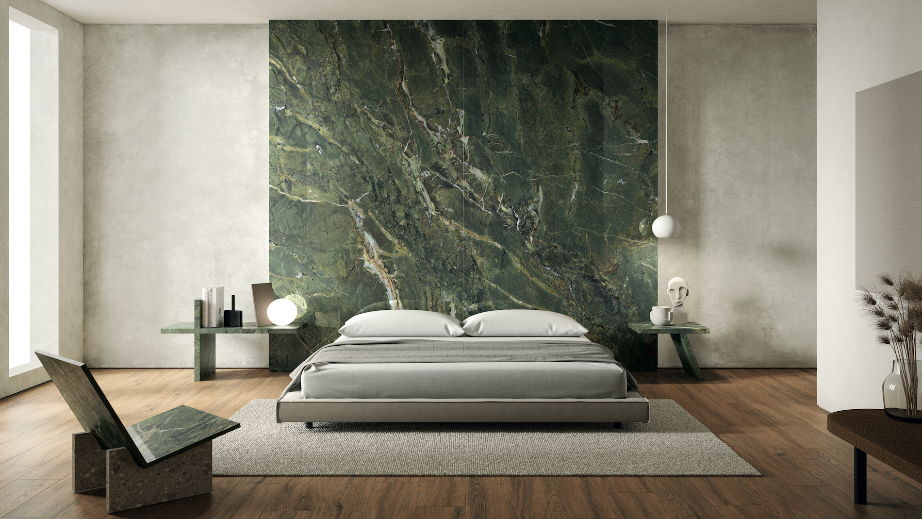 Riprodotto sulle lastre in gres porcellanato di grandi dimensioni Ultra Marmi, Brillant Green si ispira al marmo verde irlandese.
