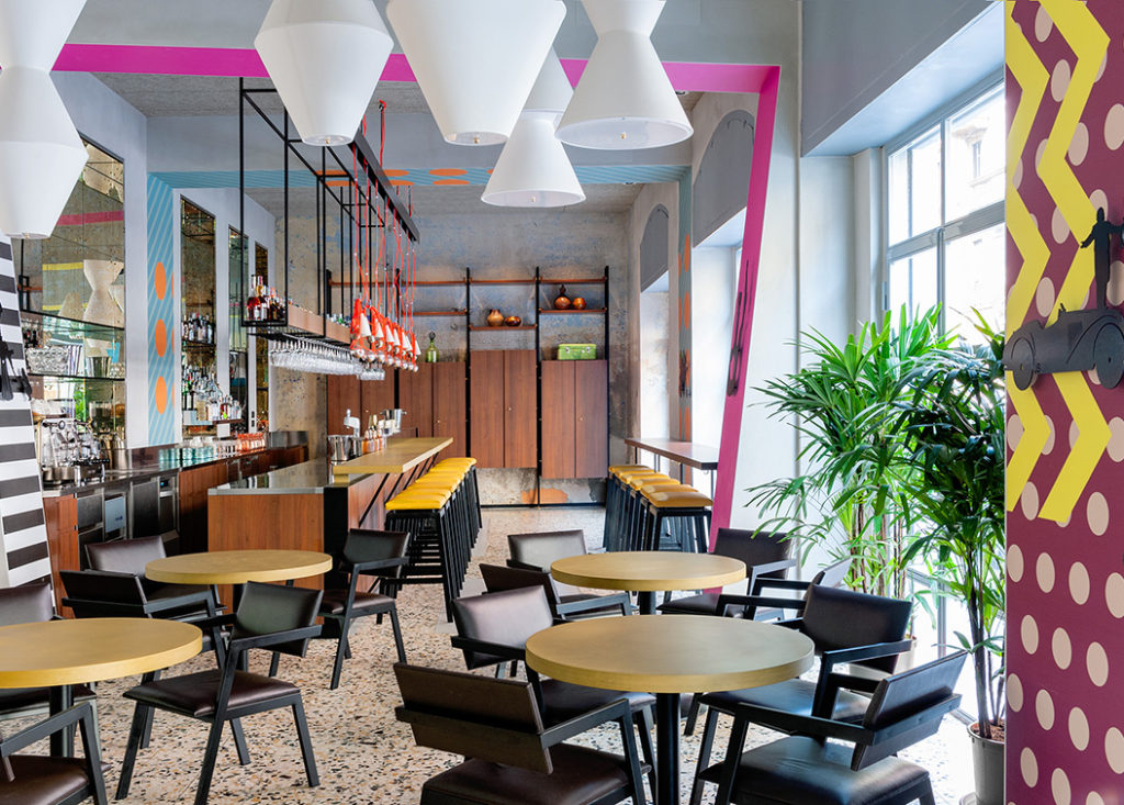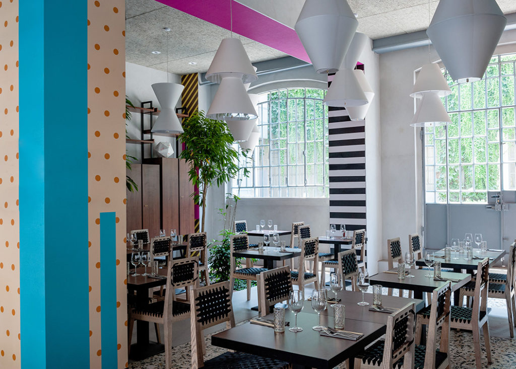 I rivestimenti murali Vescom, realizzati tramite la stampa digitale su base Lay effetto seta di elementi decorativi selezionati dal committente, hanno contribuito a mettere in scena questo mix di influenze: motivi geometrici fluo con losanghe colorate o pois segnano tutto lo spazio del ristorante e scandiscono gli ambienti del cocktail bar all’ingresso, della lounge arredata con tavolini tondi e sedie e l’area della convivialità.