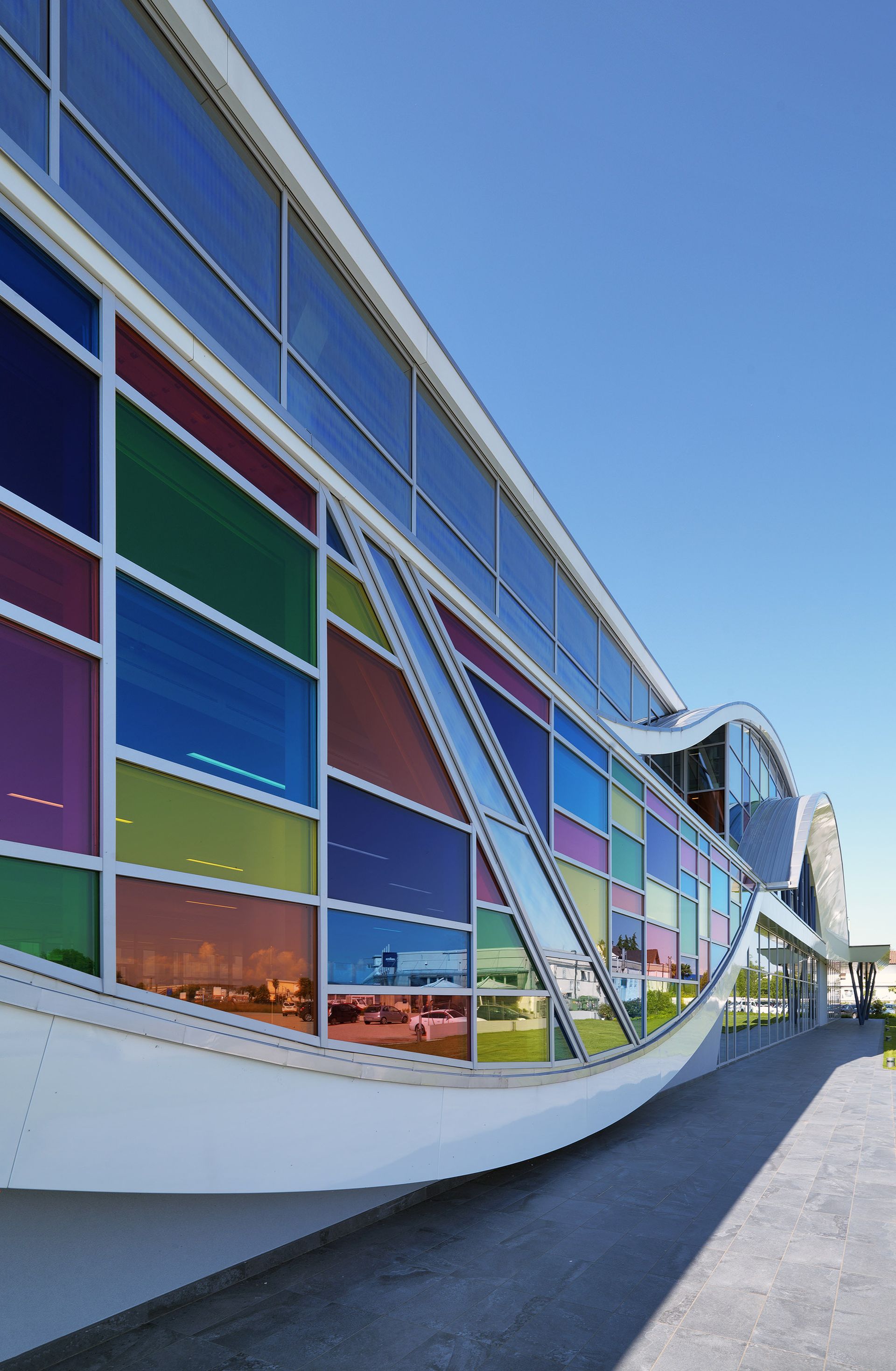Sul fronte principale, rivolto verso la strada di accesso, l’effetto sinusoidale dato dalle linee curve del rivestimento in vetroresina è stato esaltato dall’utilizzo di speciali vetri colorati che rievocano i pixel e, pertanto, il concetto di innovazione attraverso i sistemi digitali.