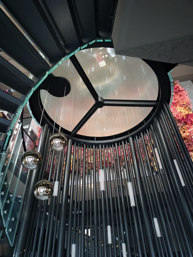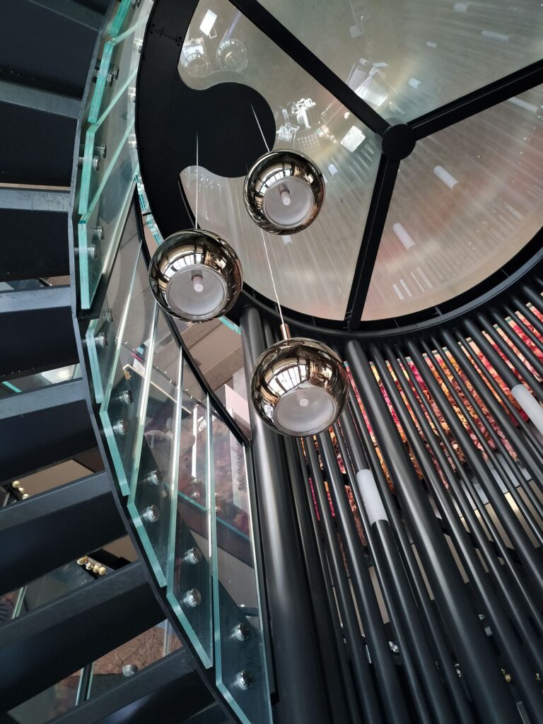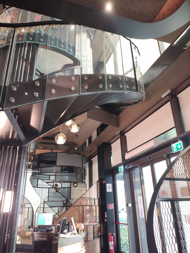 È accompagnata da tubolari luminosi in ferro e plexiglass che ne enfatizzano l’andamento verticale e conduce al primo piano, dove culmina in un’area scenografica definita “selfie point”: pavimentazione e parapetto in vetro riflettente rivolto verso il piano sottostante, e un’altalena sospesa come elemento iconico.