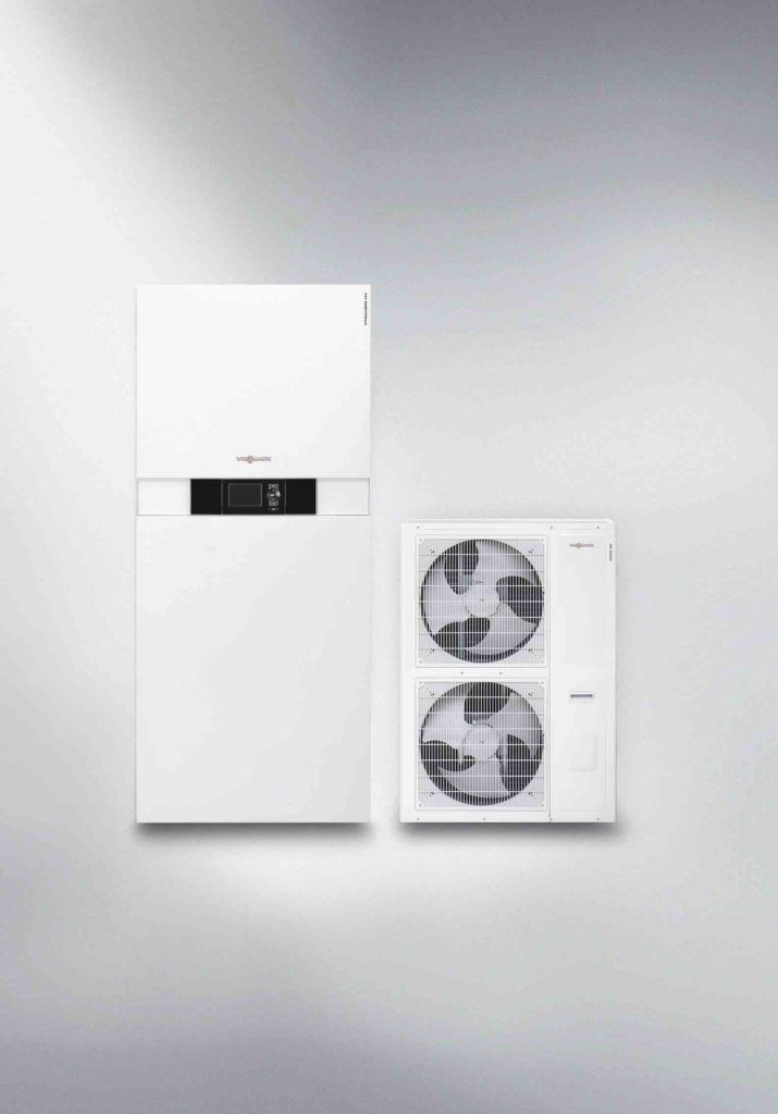 Il sistema ibrido, composto da caldaia e pompa di calore, potrà essere previsto, in sostituzione di impianti esistenti, nelle regioni con temperature esterne invernali più rigide. Nella gamma Viessmann è disponibile la soluzione Vitocaldens 222-F per interno e la soluzione per esterno Vitocal 100-A Kit Compact Hybrid.