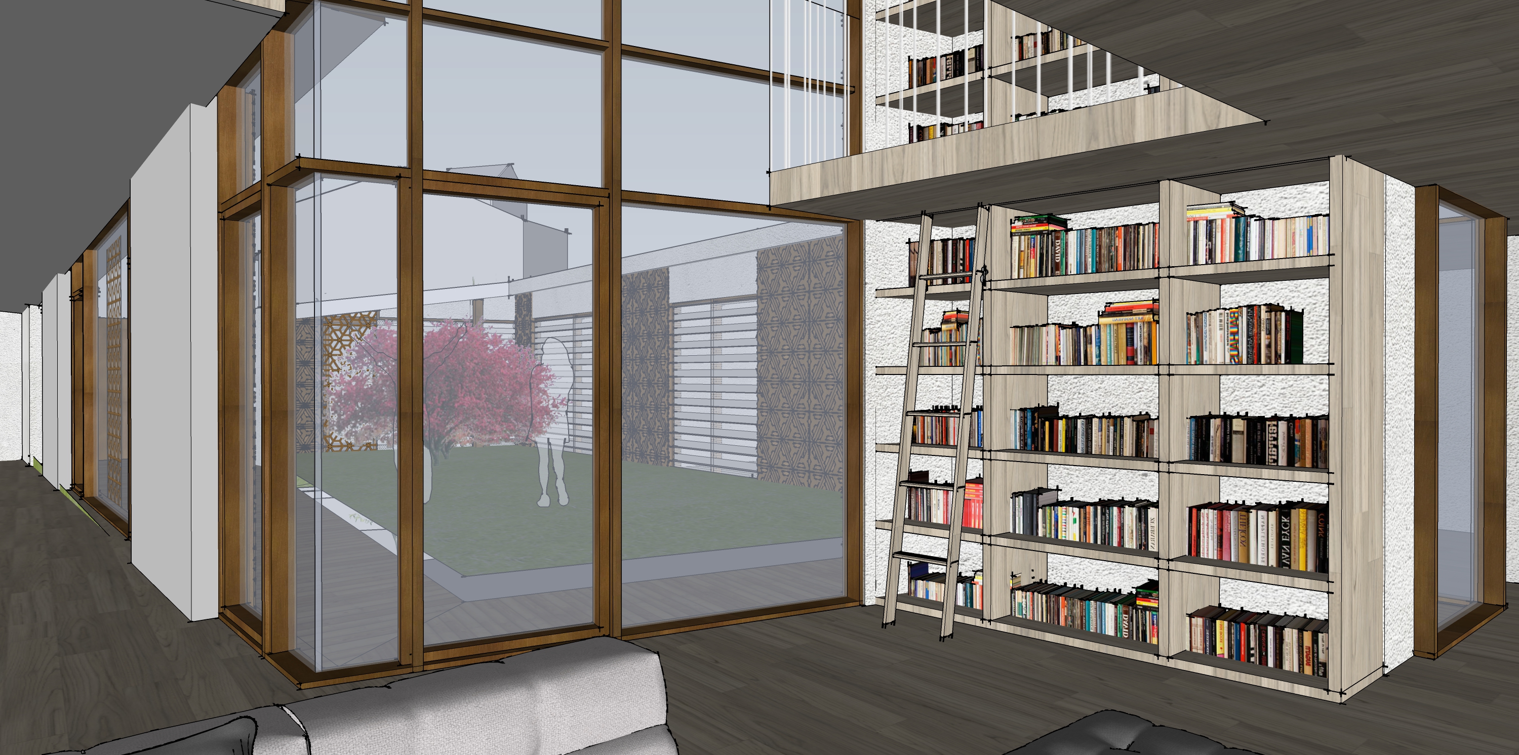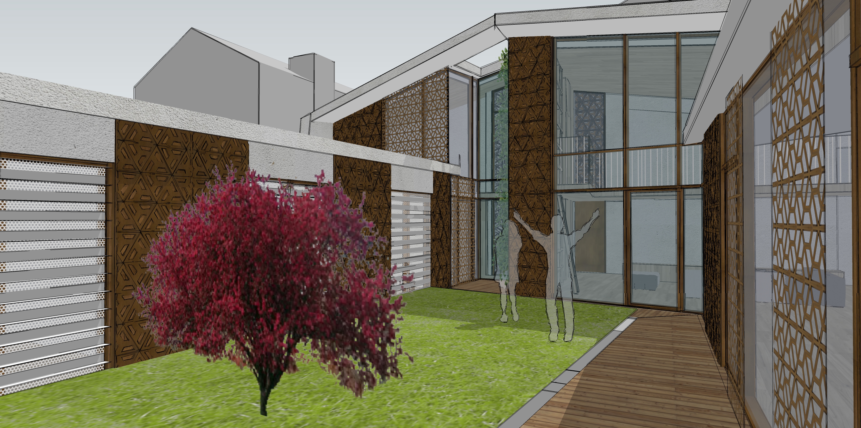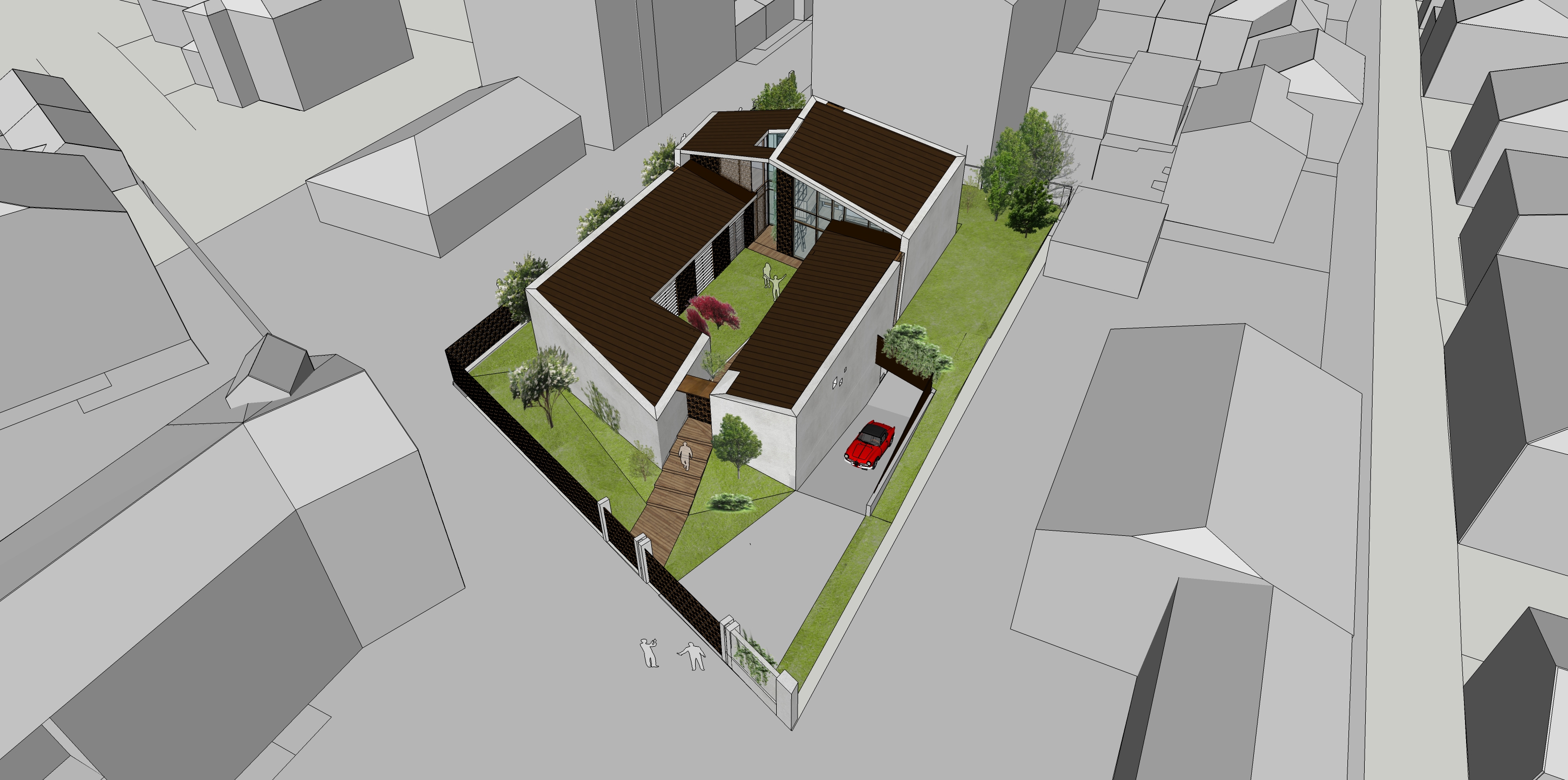 Vista dalla strada, la villa urbana risulterà come un’architettura quasi ermetica con le murature perimetrali esterne caratterizzate da minime fessure vetrate. All’interno l’edificio si apre su se stesso con grandi vetrate che si affacciano sul patio verde centrale col ruolo di portare la luce del sole e la privacy.