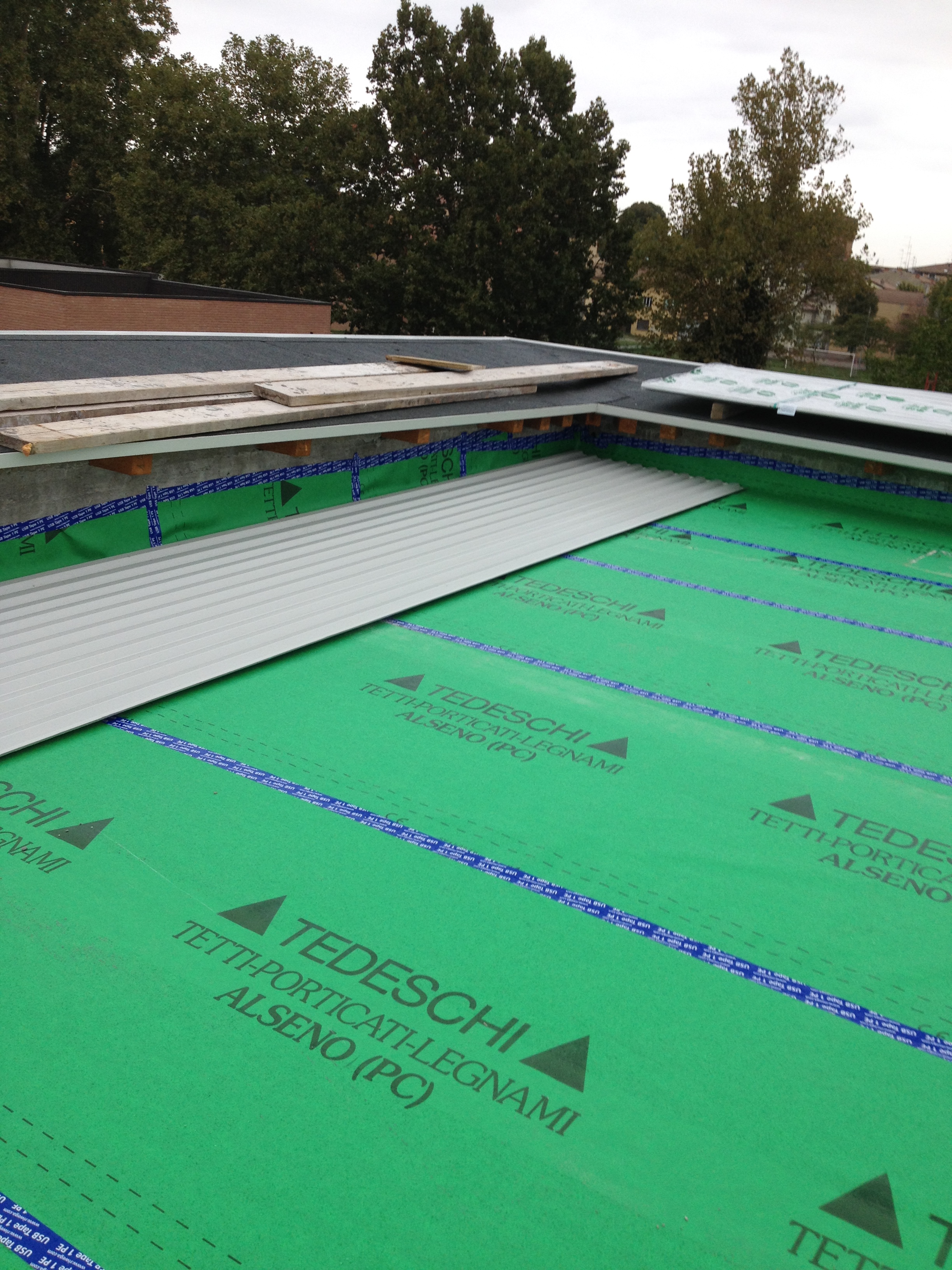 La copertura, a falda unica e bassa pendenza (3°), è contornata da una veletta di chiusura che incorpora il cornicione di travetti in legno lamellare inclinati a compluvio verso l’interno del tetto sormontati da perline impermeabilizzate da una guaina bituminosa ardesiata, ha un manto in lamiera grecata antirombo di colore bianco (della ditta Sandrini Metalli Sand 28/1120) scelto al fine di mantenere il più bassa possibile la temperatura superficiale estiva e massimizzare il rendimento dei pannelli fotovoltaici oltre a limitare la penetrazione del calore nell’abitazione.