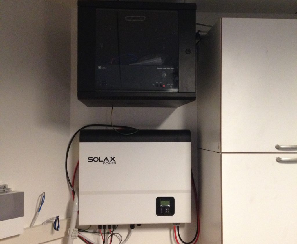 Pannelli fotovoltaici. La villa è dotata di un impianto fotovoltaico con potenza nominale pari a 4.5 kWp costituito da pannelli Viessmann Vitovolt 300 P260, inverter e controllore di carica Solax SK-Su5000c. Tutte le apparecchiature ad alimentazione elettrica autoconsumano la corrente prodotta in loco (sul tetto) dall’impianto fotovoltaico e accumulata nelle batterie da 2.5 kwh espandibili a 7.5 kwh. L’impianto fruirà dello scambio sul posto. La logica di funzionamento prevede per primo il soddisfacimento dei carichi in autoconsumo per secondo la carica delle batterie e infine l’eventuale cessione di energia elettrica alla rete.