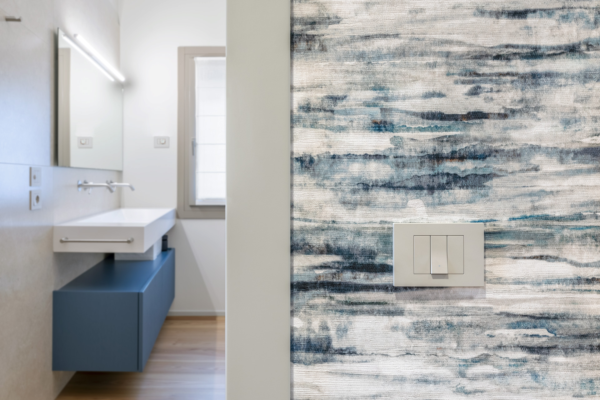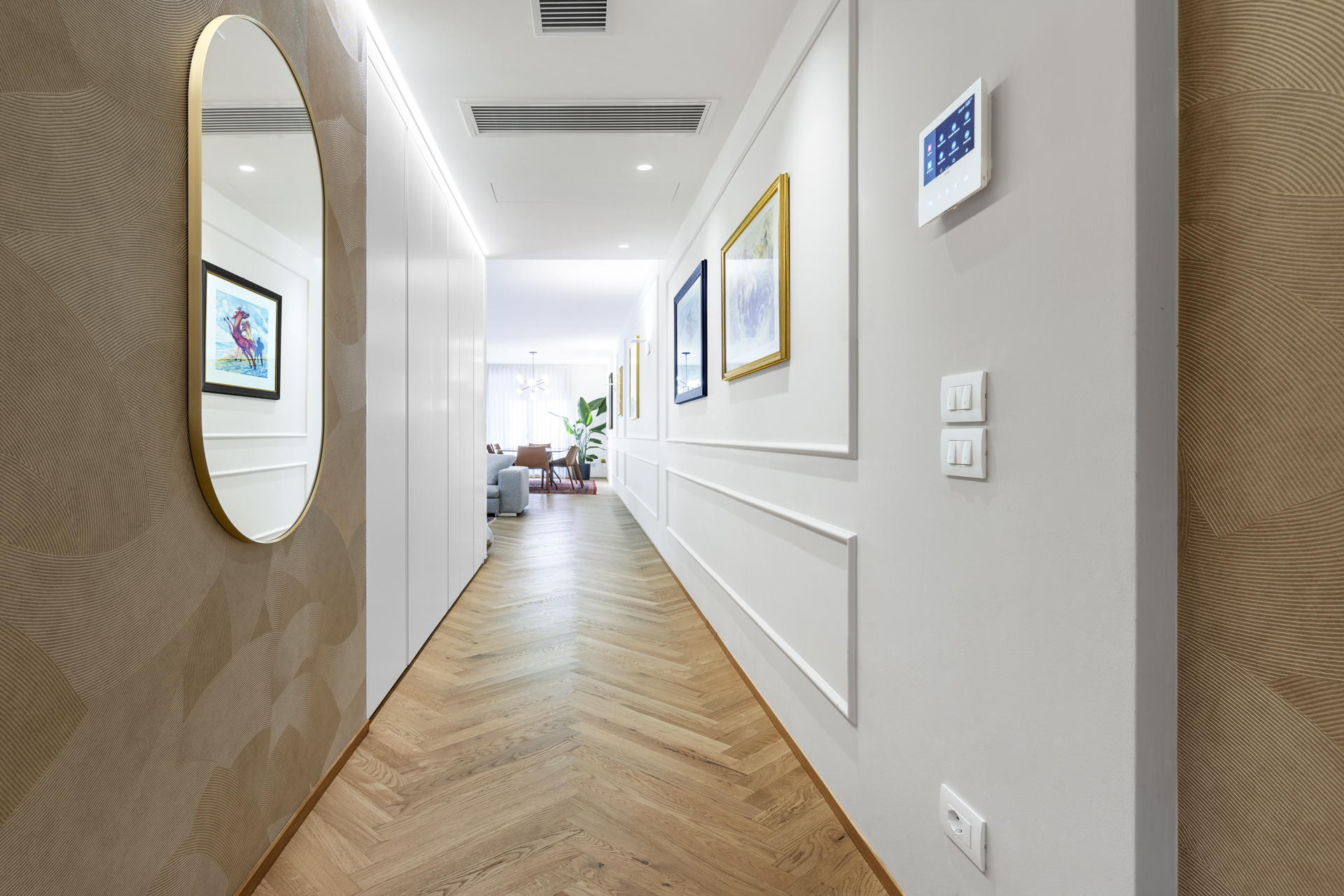 La seconda unità abitativa, inserita all’interno del moderno complesso architettonico, presenta un design raffinato e accogliente. Il pavimento in legno a spina di pesce aggiunge calore all’ambiente, accompagnato da rivestimenti nei toni del grigio e del beige e da eleganti boiserie a parete. L’atmosfera rilassante è vivacizzata dalla presenza di accessori colorati, come quadri, tappeti e poltroncine in pelle. Un tocco di classe per dare valore ai dettagli interni, deriva dalla scelta della serie civile Arké Classic, nella versione total look bianca. Geometria razionale, profilo lineare e angoli netti: un fascino intramontabile, inserito negli spazi con discrezione e armonia.