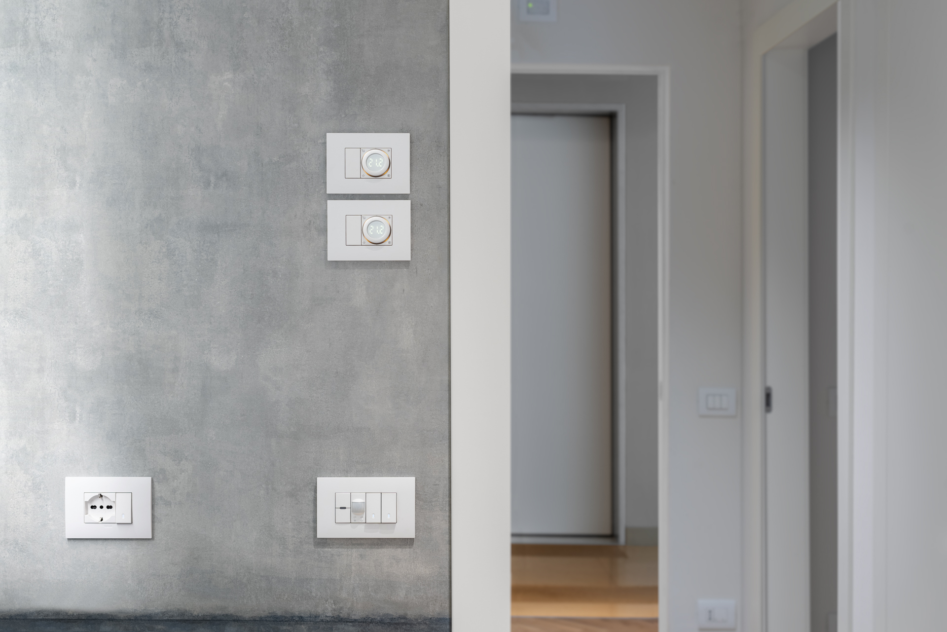 La villa indipendente, arredata in stile minimalista, è disposta su due piani collegati grazie a un’interessante scala a sbalzo, in lamiera piegata nera. Un unico spazio aperto al piano terra è suddivido da interessanti elementi d’arredo, in cui la cucina, illuminata da ampie vetrate, si apre a vista sul soggiorno. Oltre ai dettagli color blu avio, capaci di vivacizzare le neutre tonalità del grigio, spicca con il suo design pulito e inconfondibile la serie Linea di Vimar nella versione total look color canapa. I comandi allineati con tecnologia brevettata in-line, dalla delicata curvatura che rende intuitivo l’azionamento, emergono con personalità, in particolare sul rivestimento cannettato della zona giorno, sulla carta da parati della zona notte, sui rivestimenti in gres dei bagni e sulle bianche pareti. Un vero e proprio elemento d’arredo, in un ambiente dove i particolari fanno la differenza.