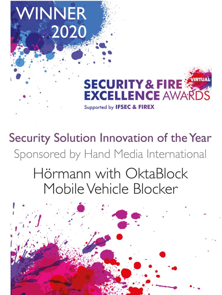 Il dissuasore temporaneo certificato OktaBlock Hörmann ha ottenuto il «Security & Fire Excellence Award 2020», premio britannico di fama internazionale, riconosce i prodotti più innovativi sul mercato della sicurezza e della protezione antincendio, a livello mondiale.