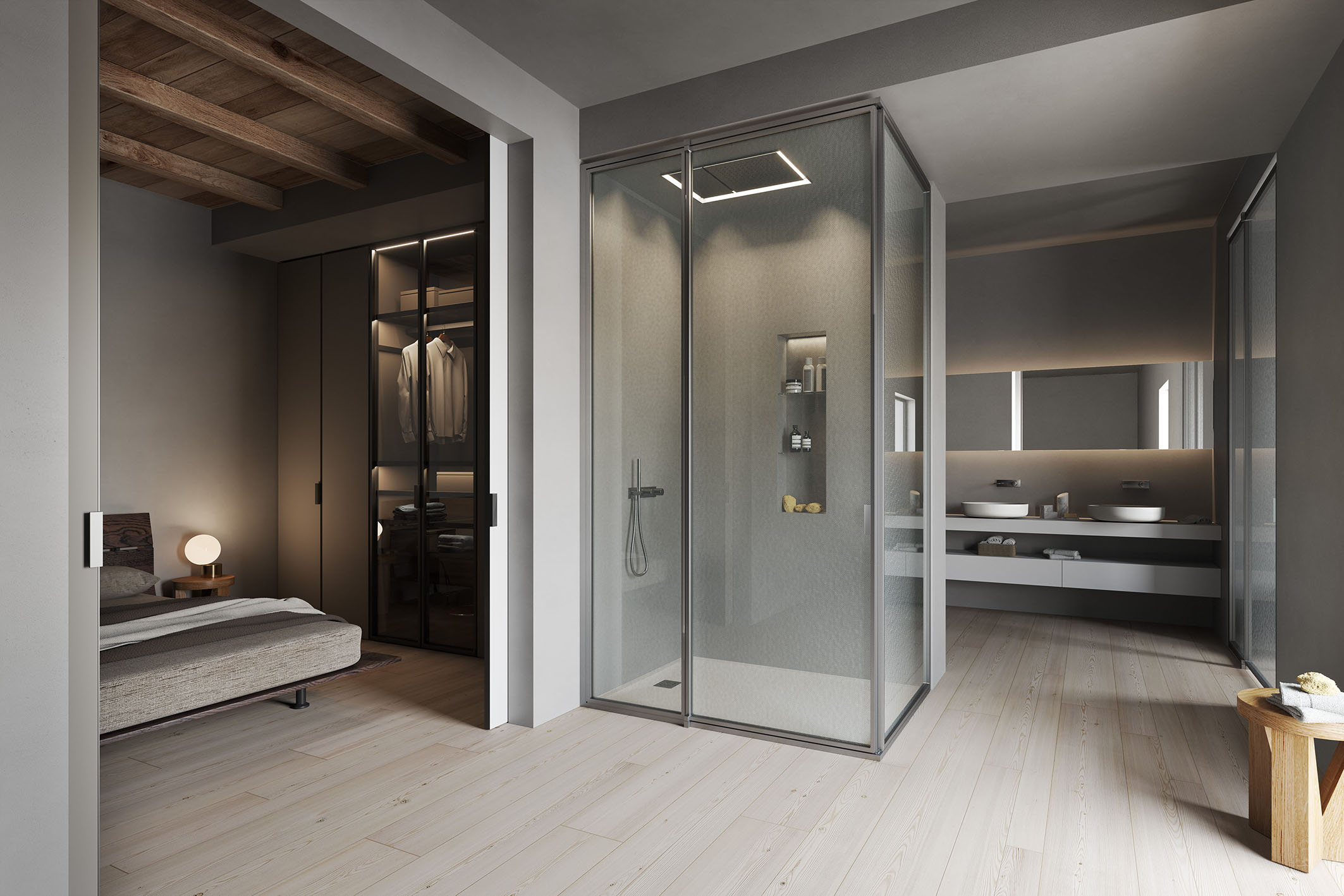 Suite di Vismaravetro è un sistema di pareti in cristallo e alluminio concepito per delimitare in un’unica soluzione la zona doccia e la zona sanitari, in ambito domestico e hotellerie. Il sistema modulare elaborato da Vismaravetro vede la presenza di pannelli fissi e porte in alluminio e vetro alti fino a 270 cm le cui innovative cerniere con apertura a 180° permettono di aumentare l’arco delle applicazioni e il comfort di utilizzo.