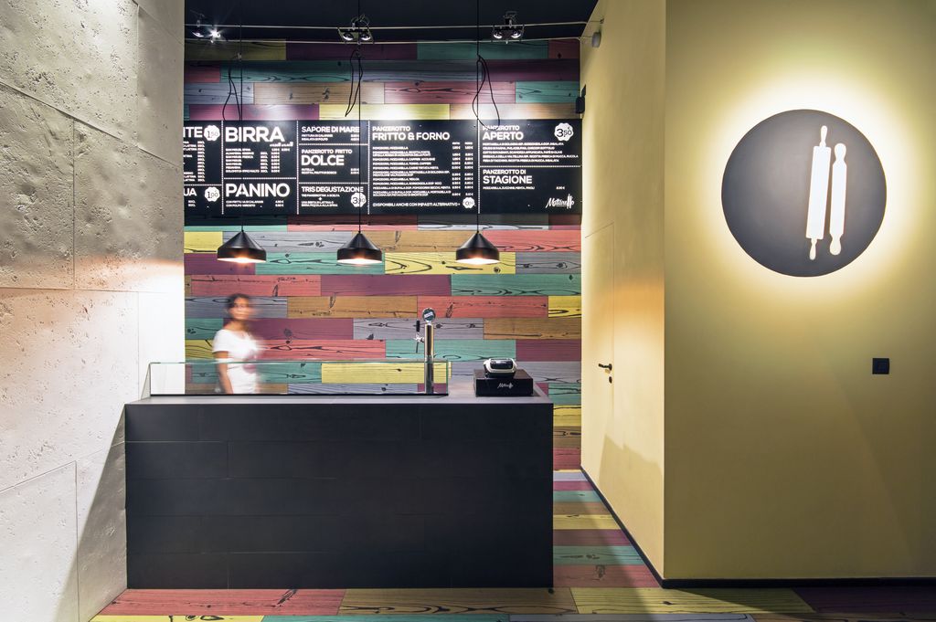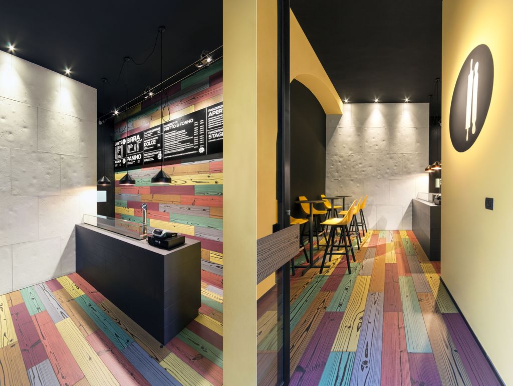 Per dare carattere a tutto il locale, è stato scelto un rivestimento decisamente eclettico: a pavimento sono state posate piastrelle in gres multicolor che, con un effetto ottico a venature, reinterpretano in chiave ironica il tradizionale parquet. “Questa superficie colorata – spiega il progettista – rigira in verticale sulla parete retro-banco, caratterizzata nella parte alta da un nastro in lamiera nera che fa da supporto alla grafica del menù, come nel classico schema del fast-food”.