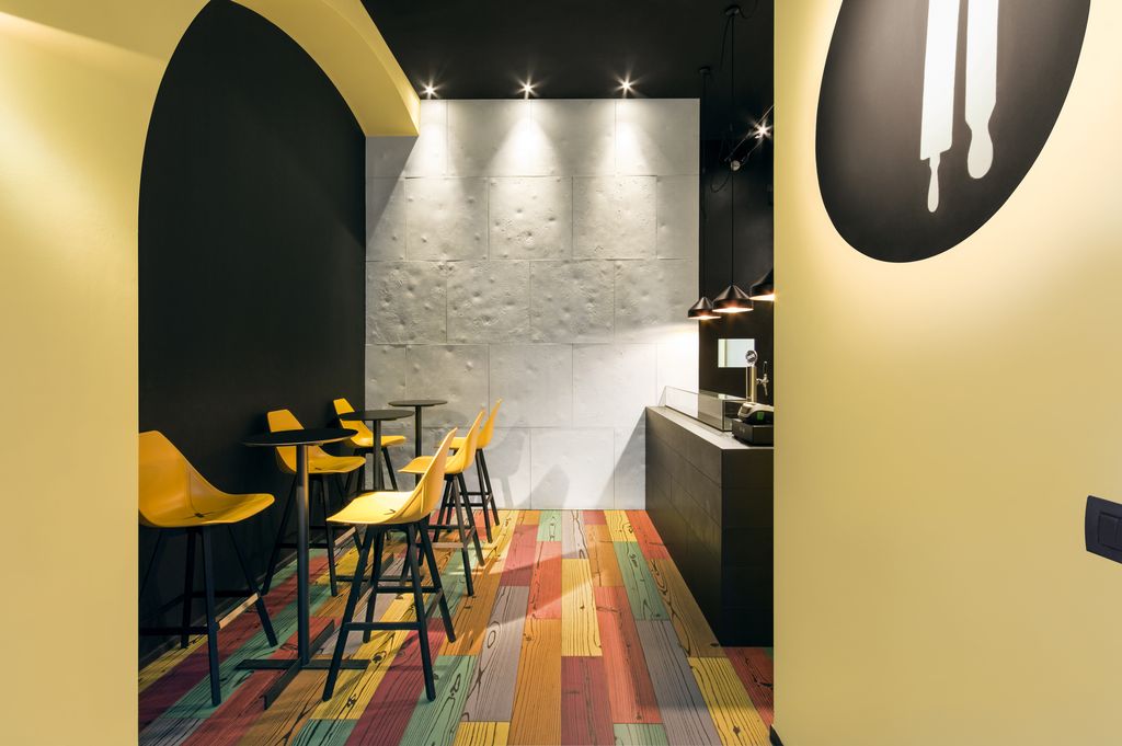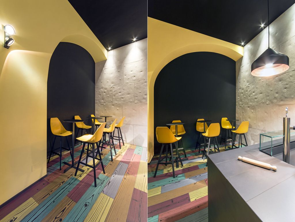 Lo spazio è arredato con pochi pezzi studiati: il bancone di vendita ha un volume monolitico ed è rivestito di gres nero, fronteggiato da tre alti tavolini e da una serie di sgabelli dalle sedute a scocca in plastica che riprendono il colore giallo delle pareti.
