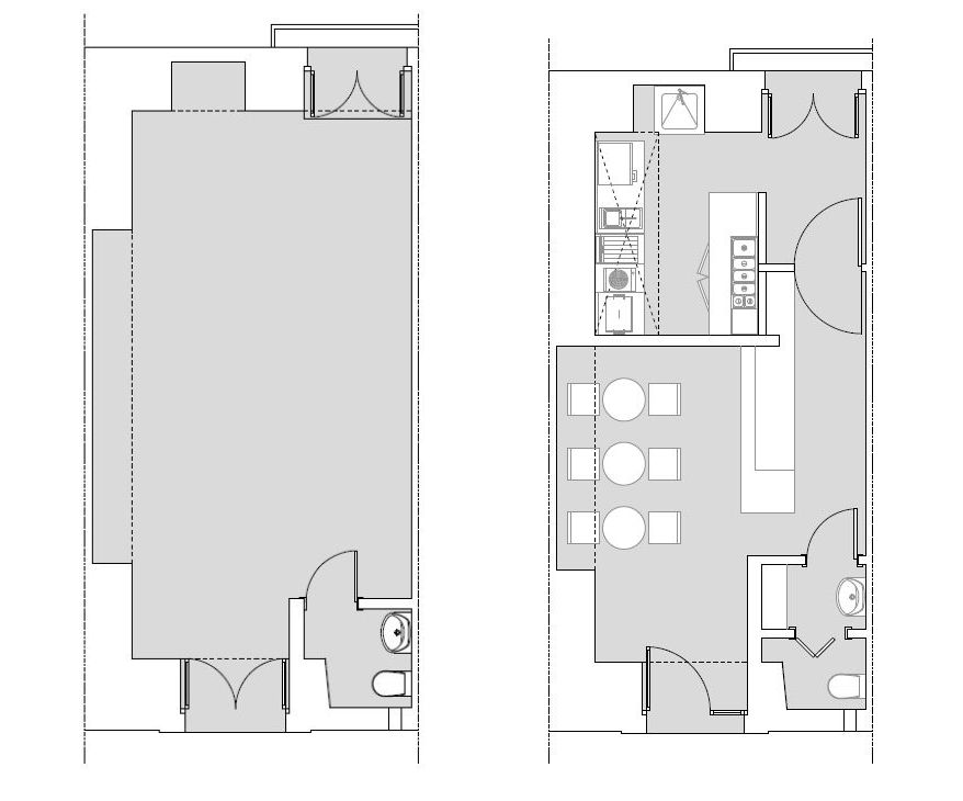 All’interno, come primo intervento, il progettista ha realizzato un tramezzo a tutta altezza per delimitare uno spazio dove organizzare la cucina, spazio a cui si può accedere anche dal cortile interno con grande utilità per le operazioni di approvvigionamento degli alimenti. Il nuovo tramezzo si interseca perpendicolarmente con una grande arcata in muratura originaria creando una sorta di nicchia, valorizzata come elemento decorativo della parete.