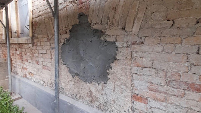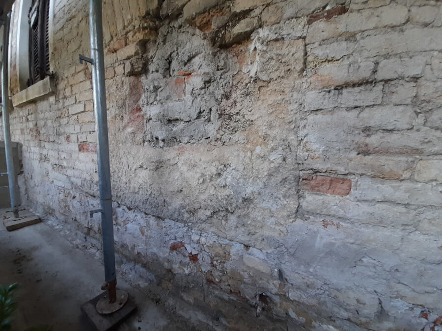 La seconda fase ha visto la demolizione degli intonaci, mentre la terza ha preso il via con la preparazione della struttura attraverso il lavoro di pulizia e idrolavaggio combinati all’applicazione di un trattamento disinfettante anti-muffa.