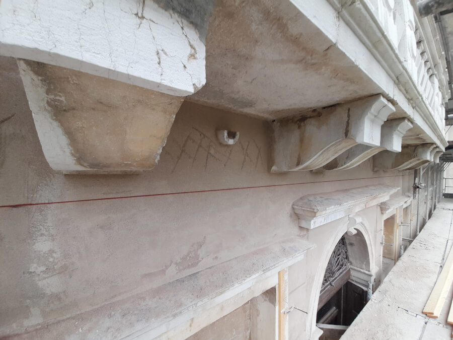 Si è scelto perciò di intervenire ristrutturando l’edificio con un sistema risanante, che ha interessato tutti gli intonaci. Il lavoro si è sviluppato in 5 fasi principali. La prima è stata caratterizzata da un attento lavoro di rilievo, che si è focalizzato sulla precisa identificazione degli elementi architettonici e decorativi presenti sulla facciata per poterli poi ripristinare, in fase di finitura, nell’esatta posizione dove si trovavano in origine.