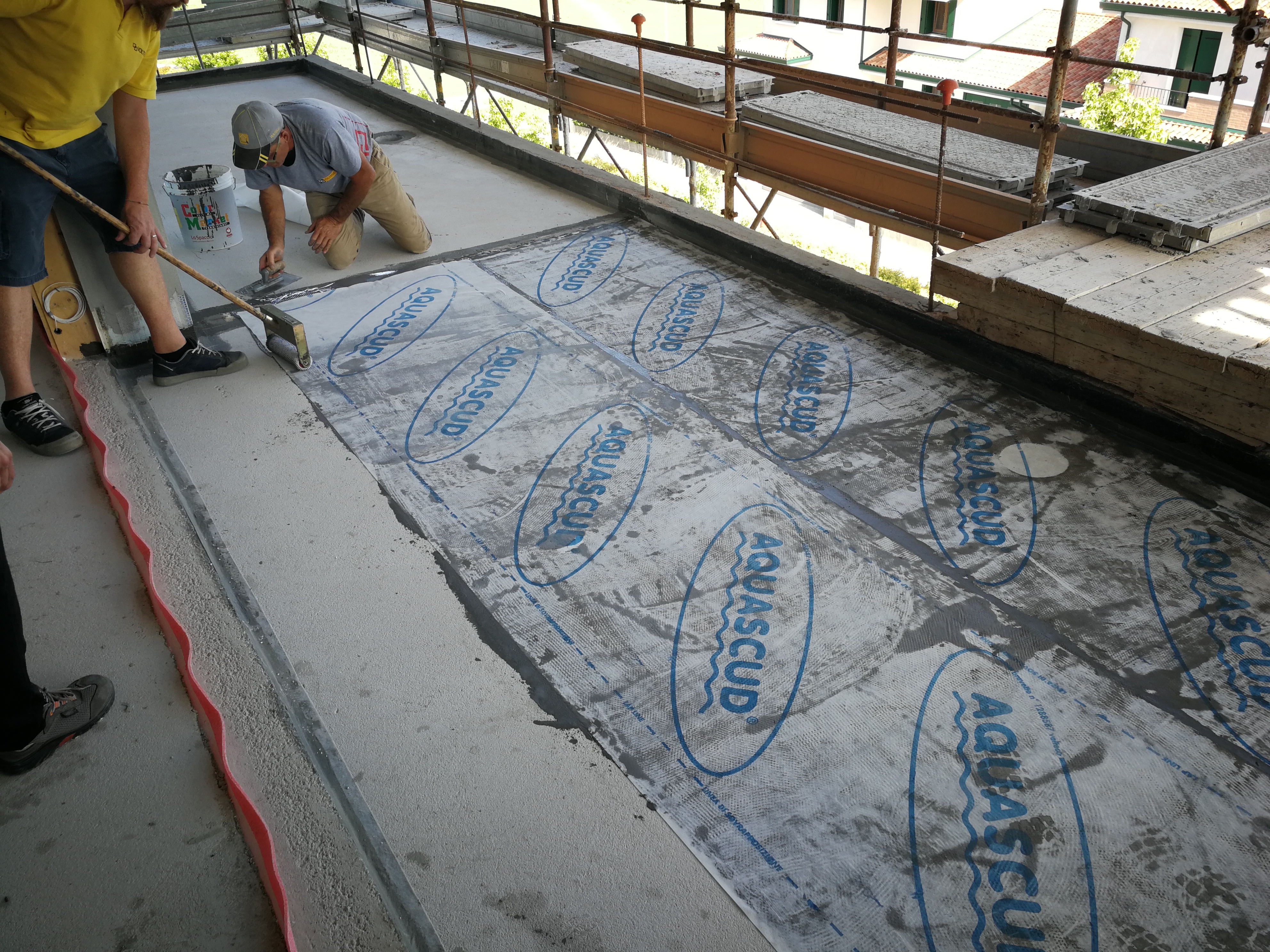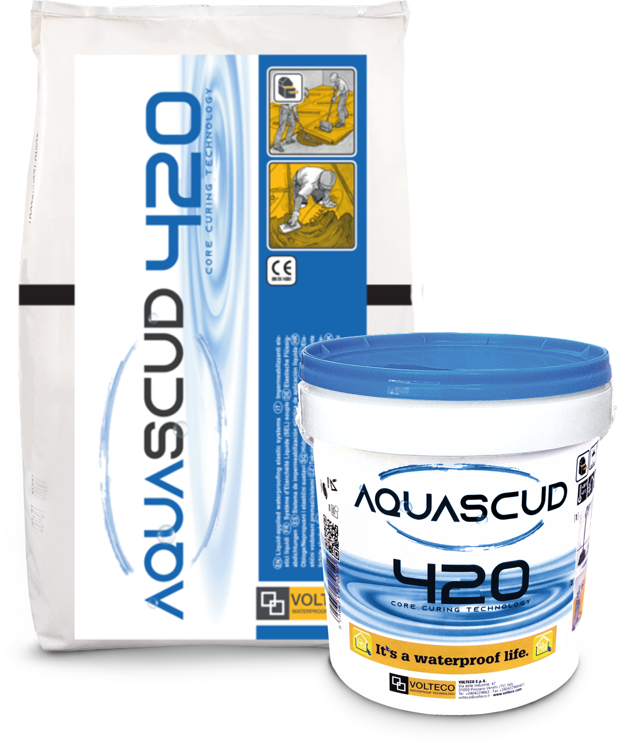 Il sistema Aquascud 420 è brevettato per impermeabilizzare senza necessità di alcuna demolizione e in ogni condizione terrazzi, balconi, marciapiedi, lastrici solari e tutte le superfici piane, anche in presenza di pavimentazione. Il sistema è composto da differenti elementi: Aquascud 420, impermeabilizzante flessibile bicomponente altamente elastico, Aquascud Join, banda coprifilo elasticizzata, Aquascud Line, profilo gocciolatoio drenante e Aquascud Basic, membrana idrorepellente microporosa elasticizzata in polipropilene con superficie ruvida che assicura una elevata adesione al componente impermeabilizzante.