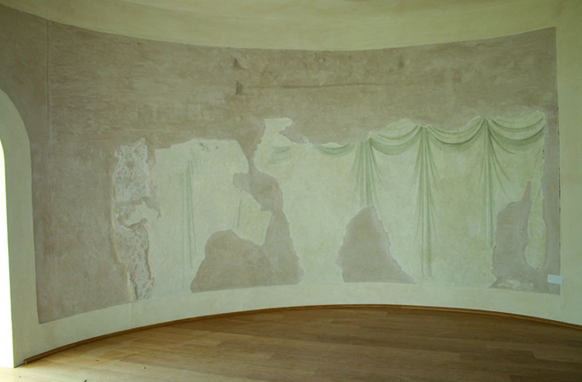 Strutture portanti, di collegamento verticale, paramenti murari interni, intonaci, stucchi e affreschi. Gli intonaci esistenti sono stati mantenuti e integrati con malte simili agli originali. A seguito di puntuali saggi, sono stati riportati alla luce strati sottostanti sui quali sono state trovate superfici pittoriche con scritte, sinopie o decorazioni di vari colori, ampie campiture localizzate nella torre e nelle sale più grandi. Le testimonianze pittoriche sono state restaurate, pulite e riquadrate da ampi spazi dove sono stati demoliti gli intonaci più recenti in maniera da evidenziare la muratura antica sottostante nelle varie fasi costruttive. Gli affreschi figurativi esistenti, localizzati nelle sale maggiori e nella cappella (di epoca alto medievale e quattrocentesca) hanno subito un restauro di consolidamento e pulitura. I saggi hanno evidenziato zone dove la muratura era particolarmente debole o non collegata, in qui è stato intrapresa una puntuale ricucitura con materiale di recupero in modo da consolidare l’intero fronte. Sono state recuperate tutte le cornici e riquadrature in gesso e gli stucchi che decorano le salette settecentesche. Il sistema della scala del XVIII secolo, realizzata con voltini in muratura di spessore modesto, è stato rinforzato con telaio esterno in acciaio chiamato ‘slitta’ dalla progettista: un’opera da fabbro studiata in parte in officina e in parte in opera, montata nella parte sottostante e finita a vernice.
