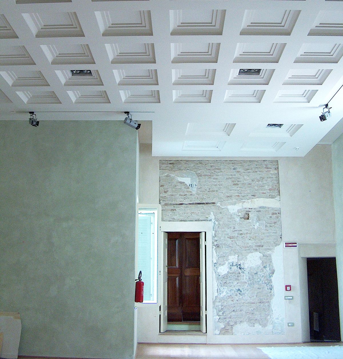 Strutture non portanti orizzontali esistenti e nuove. Quasi tutte le stanze ai due piani presentano a soffitto volte ribassate in strutture in legno con rivestimento in arellato, canne e gesso, con e senza decorazione pittorica. Questi elementi sono stati realizzati nel XVIII secolo e nell’intervento sono stati mantenuti, recuperati e consolidati, così come le decorazioni. Nelle sale più grandi sono state realizzate nuove strutture, soffittature con disegno a lacunare che ospitano l’impianto illuminotecnico e di segnalazione delle emergenze come in quelle vecchie. Le tinte delle pareti interne ed esterne sono tutte a calce.