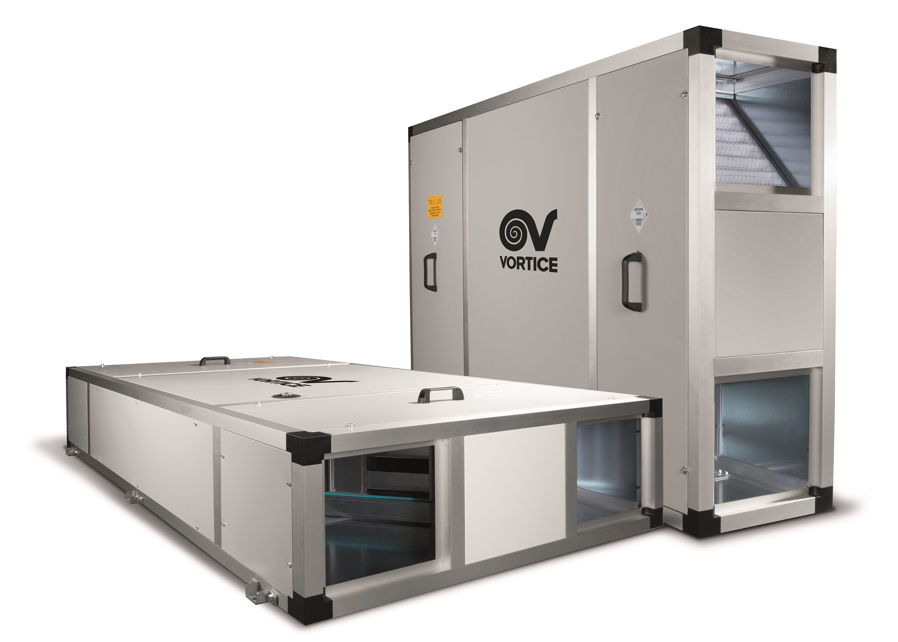 I Vort Nrg Evo Top di Vortice sono Unità di Ventilazione centralizzata a doppio flusso con recupero di calore equipaggiati di scambiatori a piastre di alluminio del tipo a flussi incrociati in controcorrente e motoventilatori Ec (brushless). Sono completi di controllo e regolazione con scheda elettronica e display remoto Lcd.