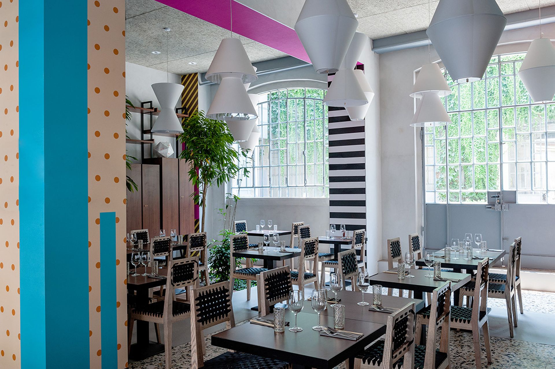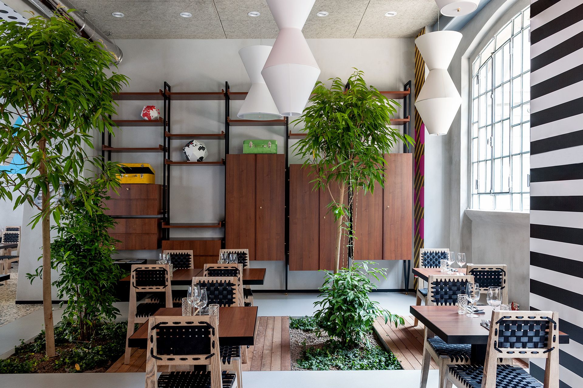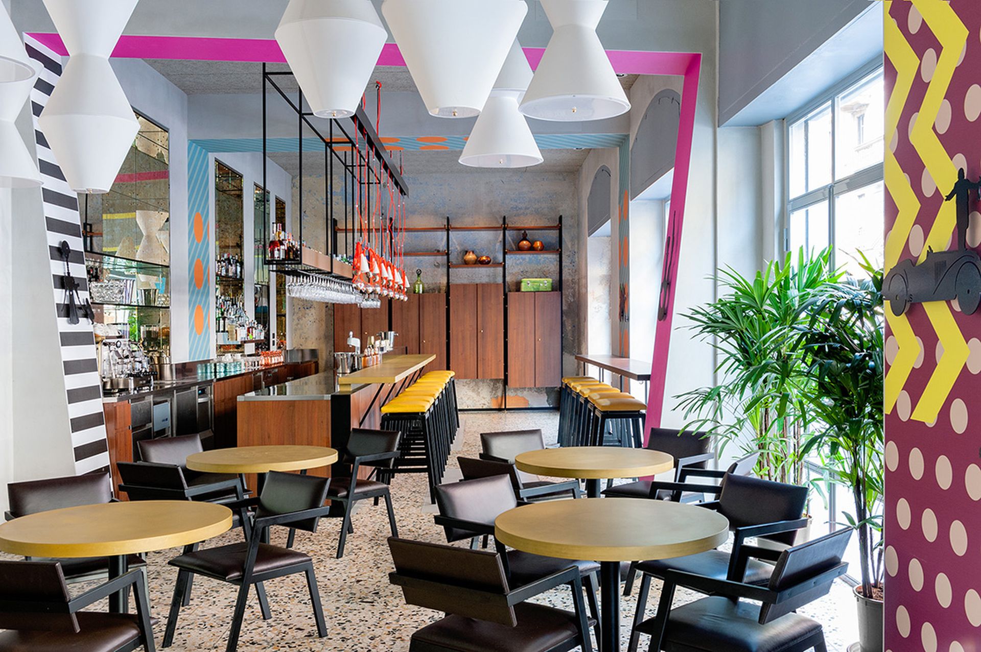 L’arredo presenta evidenti richiami ai grandi maestri della Milano degli anni ‘50/’60: a Franco Albini s’ispirano i due mobili realizzati per l’ingresso e la sala ristorante. In laminato noce, con struttura in ferro verniciato nero e dettagli in ottone, espongono suppellettili che evocano luoghi, ricordi, esperienze dei viaggi delle chef; l’omaggio a Ettore Sottsass è invece evidente dallo stile libero e radicale dei portali che caratterizzano l’architettura del locale e scandiscono gli spazi. In contrasto con la cornice neutra dei soffitti, questi elementi si caratterizzano per carte da parati con motivi colorati e inserti geometrici fluo.